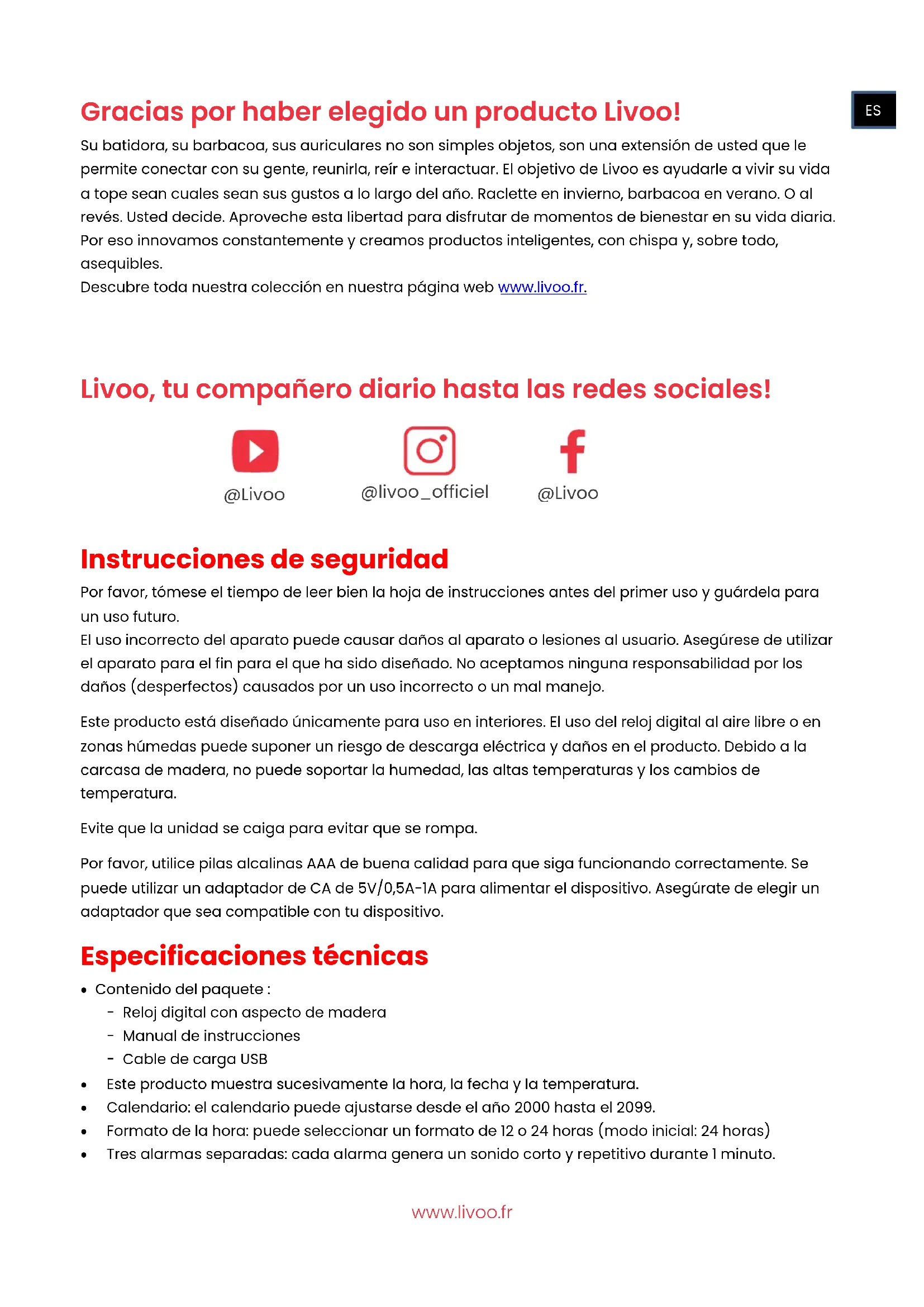 - Die Produktinformationen können ohne vorherige Ankündigung geändert werden. ----------------------------------------------------------------------------------------------www.livoo.fr Gracias por haber elegido un producto Livoo! Su batidora, su barbacoa, sus auriculares no son simples objetos, son una extensión de usted que le permite conectar con su gente, reunirla, reír e interactuar. El objetivo de Livoo es ayudarle a vivir su vida a tope sean cuales sean sus gustos a lo largo del año. Raclette en invierno, barbacoa en verano. O al revés. Usted decide. Aproveche esta libertad para disfrutar de momentos de bienestar en su vida diaria. Por eso innovamos constantemente y creamos productos inteligentes, con chispa y, sobre todo, asequibles. Descubre toda nuestra colección en nuestra página web www.livoo.fr.
