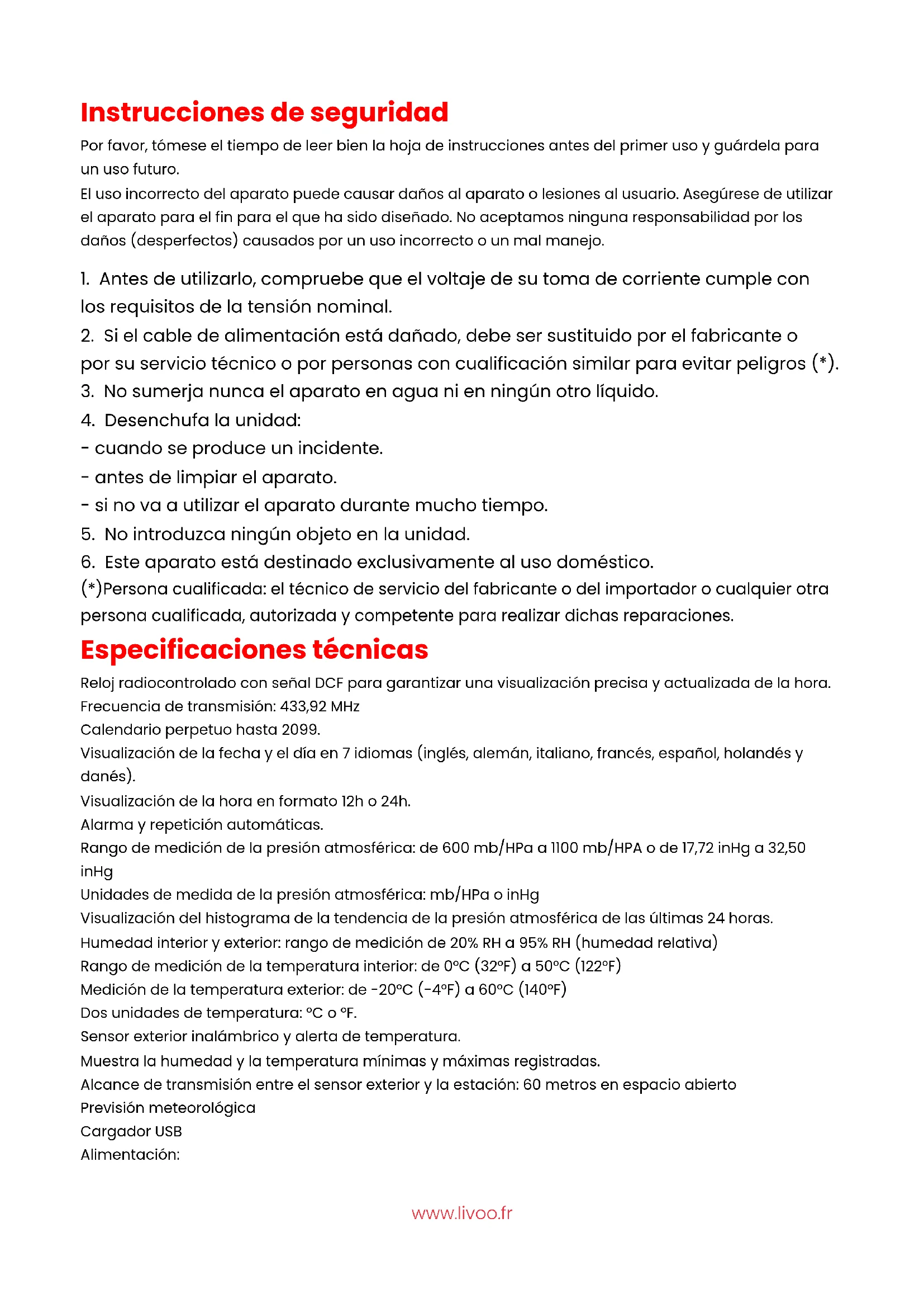 (*)Persona cualificada: el técnico de servicio del fabricante o del importador o cualquier otra persona cualificada, autorizada y competente para realizar dichas reparaciones. Especificaciones técnicas Reloj radiocontrolado con señal DCF para garantizar una visualización precisa y actualizada de la hora. Frecuencia de transmisión: 433,92 MHz Calendario perpetuo hasta 2099. Visualización de la fecha y el día en 7 idiomas (inglés, alemán, italiano, francés, español, holandés y danés). Visualización de la hora en formato 12h o 24h. Alarma y repetición automáticas. Rango de medición de la presión atmosférica: de 600 mb/HPa a 1100 mb/HPA o de 17,72 inHg a 32,50 inHg Unidades de medida de la presión atmosférica: mb/HPa o inHg Visualización del histograma de la tendencia de la presión atmosférica de las últimas 24 horas. Humedad interior y exterior: rango de medición de 20% RH a 95% RH (humedad relativa) Rango de medición de la temperatura interior: de 0°C (32°F) a 50°C (122°F) Medición de la temperatura exterior: de -20°C (-4°F) a 60°C (140°F) Dos unidades de temperatura: °C o °F. Sensor exterior inalámbrico y alerta de temperatura. Muestra la humedad y la temperatura mínimas y máximas registradas. Alcance de transmisión entre el sensor exterior y la estación: 60 metros en espacio abierto Previsión meteorológica Cargador USB Alimentación:www.livoo.fr Estación meteorológica Batería: 2 x AA LR6 ou o cargador DC5.0V 1.2A Sensor exterior Batería: 2 x LR03 AAA