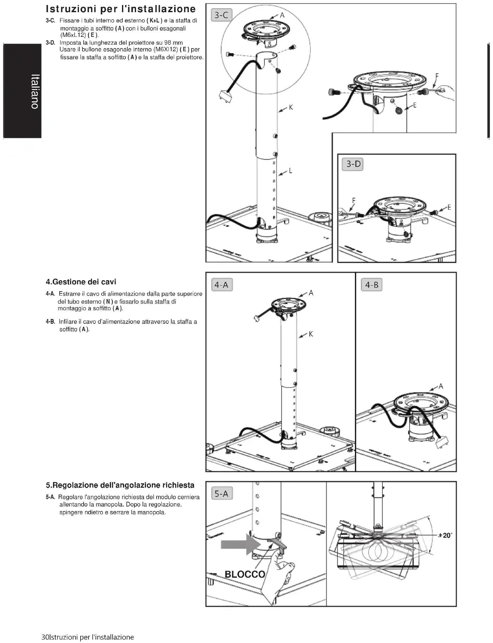3-C. Fije los tubos internos y externos ( K+L ) y el soporte para instalación en el techo ( A ) con los tornillos Allen (M6xL12) ( E ).3-D. Ajuste la longitud del proyector en 98 mm Utilice el perno hexagonal interno (M6Xl12) ( E ) para fijar el soporte del techo ( A ) y el soporte del proyector