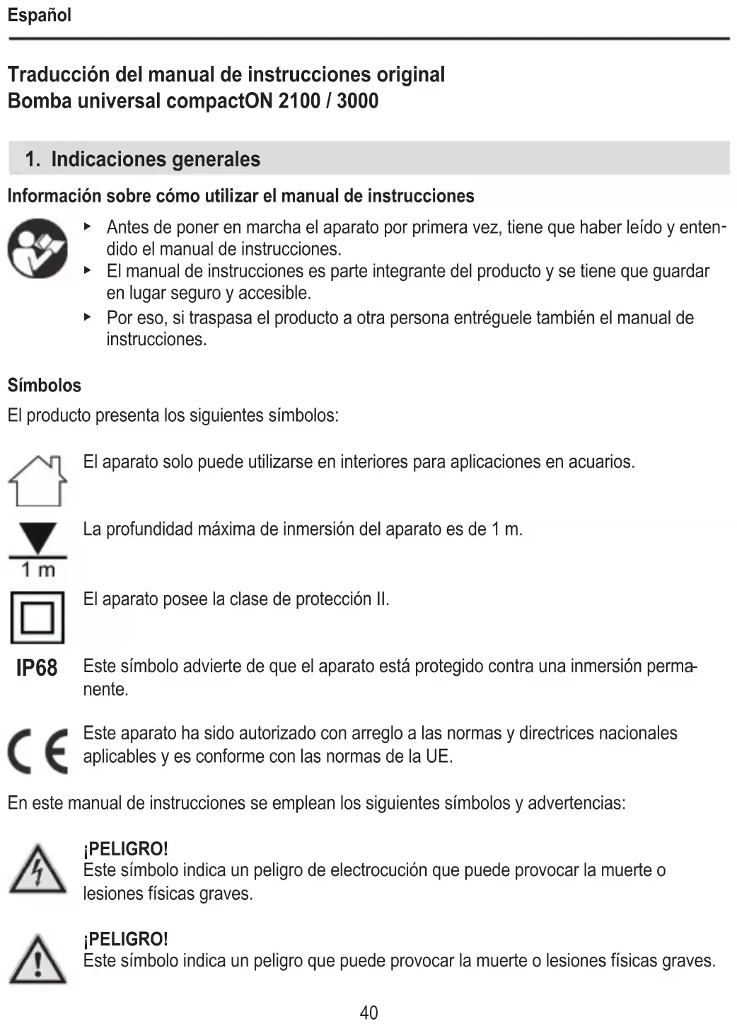 nente. Este aparato ha sido autorizado con arreglo a las normas y directrices nacionales aplicables y es conforme con las normas de la UE. En este manual de instrucciones se emplean los siguientes símbolos y advertencias: ¡PELIGRO! Este símbolo indica un peligro de electrocución que puede provocar la muerte o lesiones físicas graves. ¡PELIGRO! Este símbolo indica un peligro que puede provocar la muerte o lesiones físicas graves. IP68Español