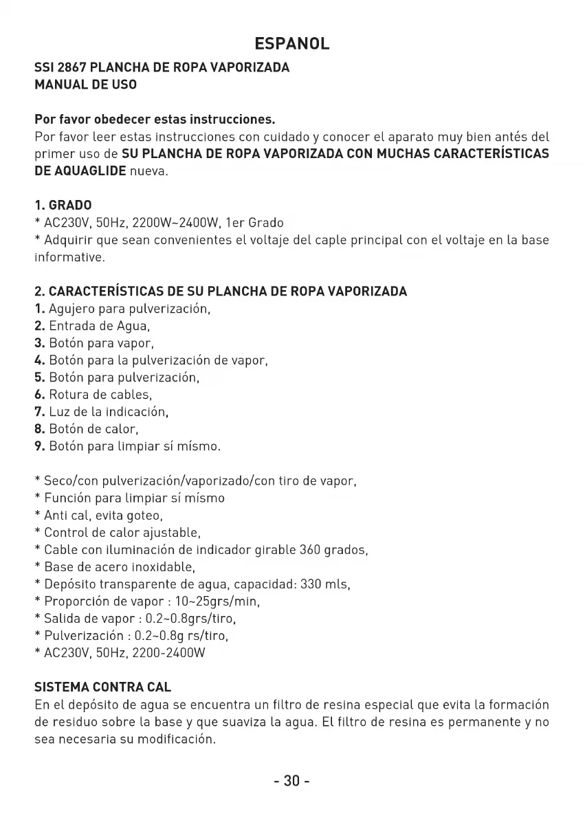 Por favor obedecer estas instrucciones. Por favor leer estas instrucciones con cuidado y conocer el aparato muy bien antés del primer uso de SU PLANCHA DE ROPA VAPORIZADA CON MUCHAS CARACTERÍSTICAS DE AQUAGLIDE nueva.