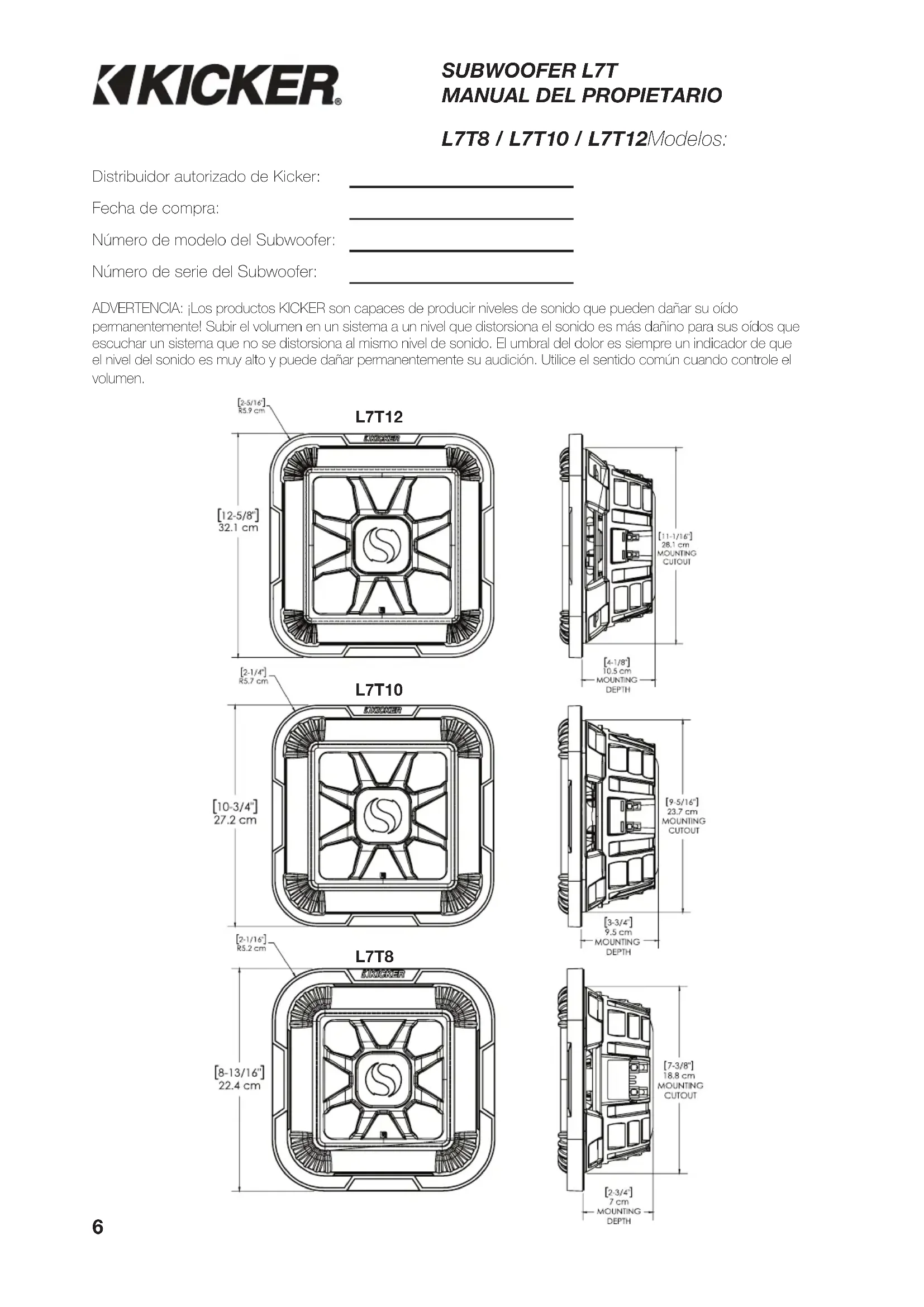 Distribuidor autorizado de Kicker: Fecha de compra: Número de modelo del Subwoofer: Número de serie del Subwoofer: L7T8 / L7T10 / L7T12Modelos: ADVERTENCIA: ¡Los productos KICKER son capaces de producir niveles de sonido que pueden dañar su oído permanentemente! Subir el volumen en un sistema a un nivel que distorsiona el sonido es más dañino para sus oídos que escuchar un sistema que no se distorsiona al mismo nivel de sonido. El umbral del dolor es siempre un indicador de que el nivel del sonido es muy alto y puede dañar permanentemente su audición. Utilice el sentido común cuando controle el volumen. L7T8 L7T10 L7T12 2019 L7T Rev D.indd 62019 L7T Rev D.indd 6 2/14/2019 9:50:14 AM2/14/2019 9:50:14 AM7 ESPECIFICACIONES Modelo L7T8 L7T10 L7T12 Impedancia nominal [Ω] 2 o 4 2 o 4 2 o 4 Fs [Hz] 45.4 30.75 26.3 Manejo de potencia recomendado [RMS vatios] 350 500 600 Manejo de potencia maximo [vatios] 700 1000 1200 Sensibilidad [1W, 1m] 84.835 85.98 86.54 Xmax (Lineal Excursión) [mm] 7.25 9.2 10.25 Re [Ω] 7.37 7.42 7.14 Qms 8.516 9.33 8.7605 Qes 0.674 0.563 0.641 Qts 0.625 0.531 0.597 Mms [g] 99.385 175.13 242.952 Sd [cm