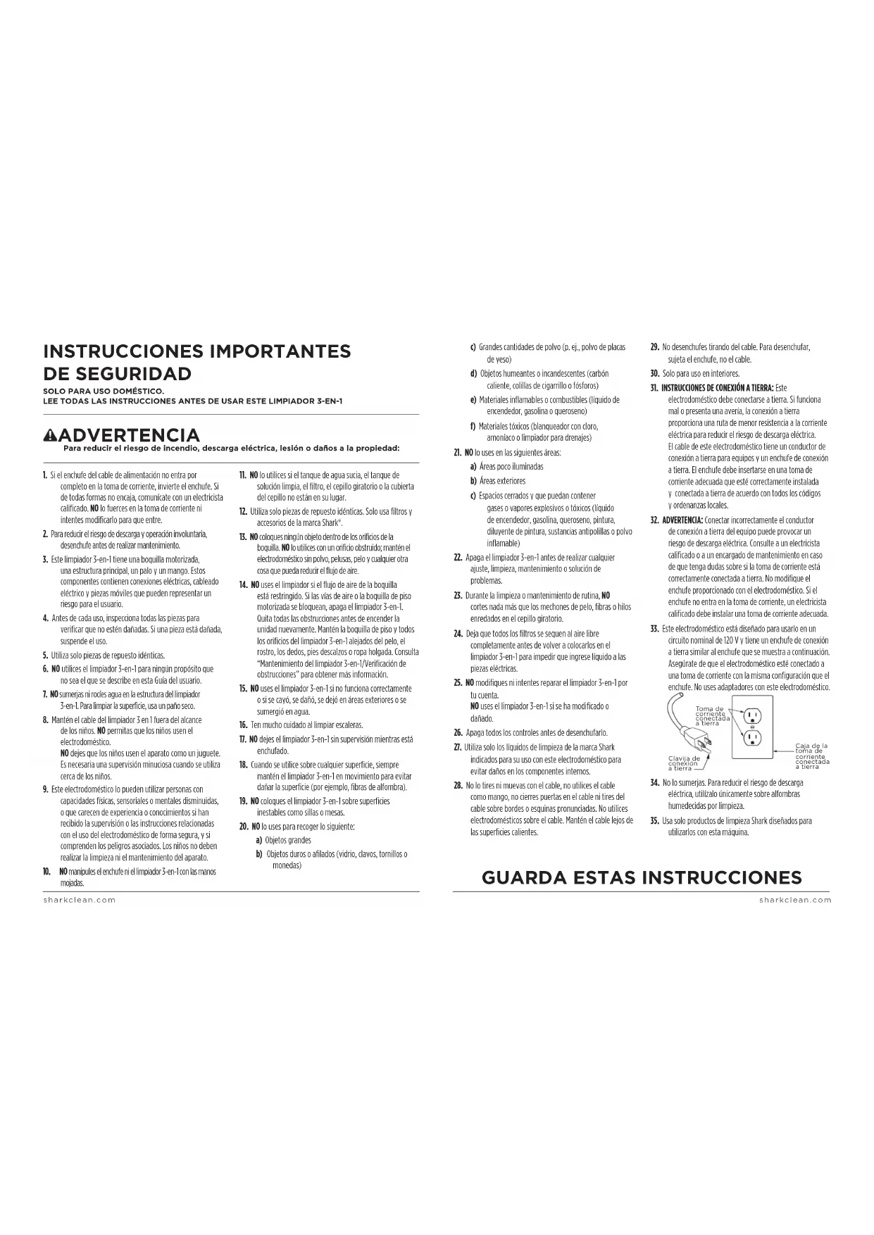 ADVERTENCIA Para reducir el riesgo de incendio, descarga eléctrica, lesión o daños a la propiedad: INSTRUCCIONES IMPORTANTES DE SEGURIDAD SOLO PARA USO DOMÉSTICO. LEE TODAS LAS INSTRUCCIONES ANTES DE USAR ESTE LIMPIADOR 3-EN-1 sharkclean.comsharkclean.comNOTA: Utiliza únicamente el concentrado Shark HydroVac Multi-Surface Concentrate, desinfectante Shark HydroVac y agua con este producto. Otras fórmulas, soluciones y limpiadores domésticos pueden (1) causar rayas y espuma, o (2) dañar tu HydroVac. NOTA: Si el tanque de solución limpia está vacío, la unidad puede emitir un sonido de bombeo. Esto es normal. Llena el tanque de solución limpia para continuar. NOTA: Asegúrate de no llenar en exceso el tanque de solución limpia con más concentrado que el indicado, ya que esto puede provocar la aparición de rayas. NOTA: El limpiador 3-en-1 no funcionará sin suficiente suministro de agua en el tanque de solución limpia.