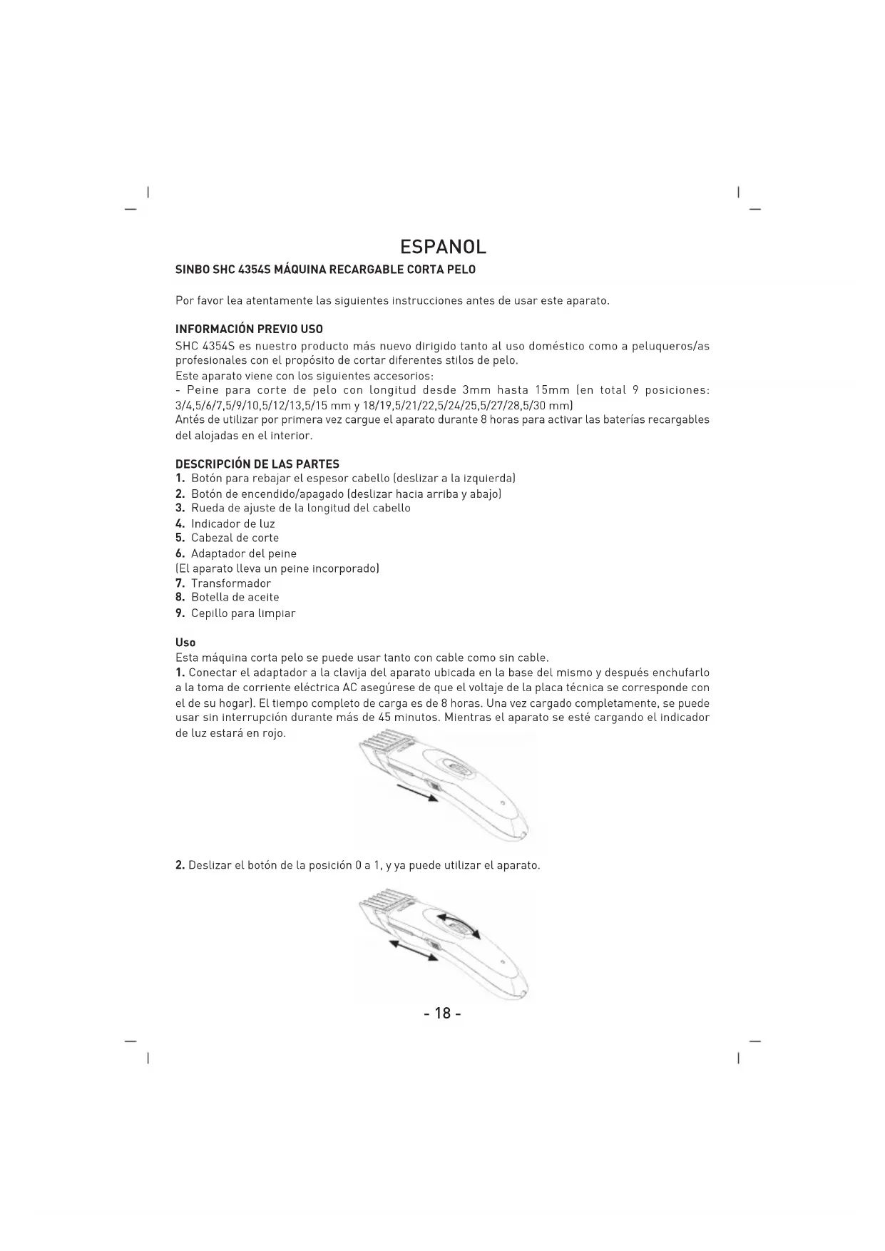 SHC 4354S es nuestro producto más nuevo dirigido tanto al uso doméstico como a peluqueros/as profesionales con el propósito de cortar diferentes stilos de pelo. Este aparato viene con los siguientes accesorios: - Peine para corte de pelo con longitud desde 3mm hasta 15mm (en total 9 posiciones: 3/4,5/6/7,5/9/10,5/12/13,5/15 mm y 18/19,5/21/22,5/24/25,5/27/28,5/30 mm) Antés de utilizar por primera vez cargue el aparato durante 8 horas para activar las baterías recargables del alojadas en el interior.