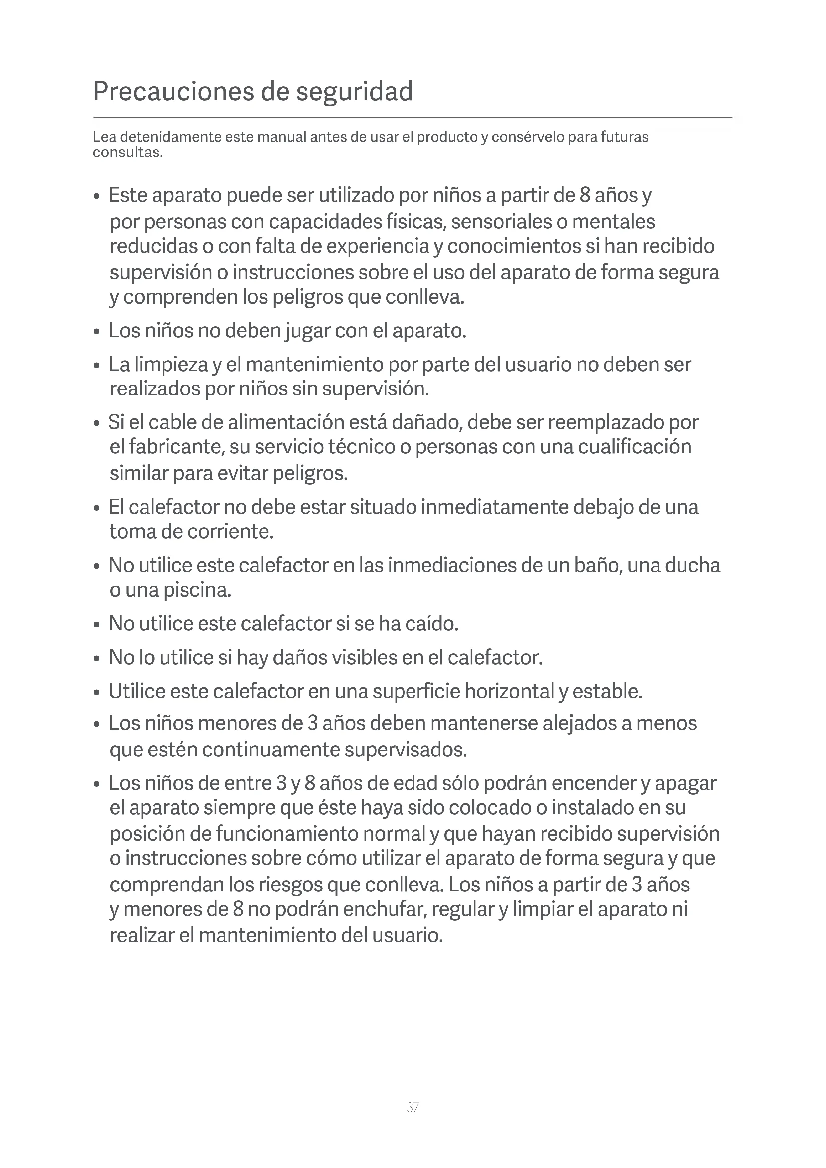 - Los niños de entre 3 y 8 años de edad sólo podrán encender y apagar el aparato siempre que éste haya sido colocado o instalado en su posición de funcionamiento normal y que hayan recibido supervisión o instrucciones sobre cómo utilizar el aparato de forma segura y que comprendan los riesgos que conlleva. Los niños a partir de 3 años y menores de 8 no podrán enchufar, regular y limpiar el aparato ni realizar el mantenimiento del usuario. Precauciones de seguridad Lea detenidamente este manual antes de usar el producto y consérvelo para futuras consultas.38 Algunas partes de este producto pueden calentarse mucho y causar quemaduras. Hay que prestar especial atención cuando haya niños y personas vulnerables. PRECAUCIÓN ADVERTENCIAS