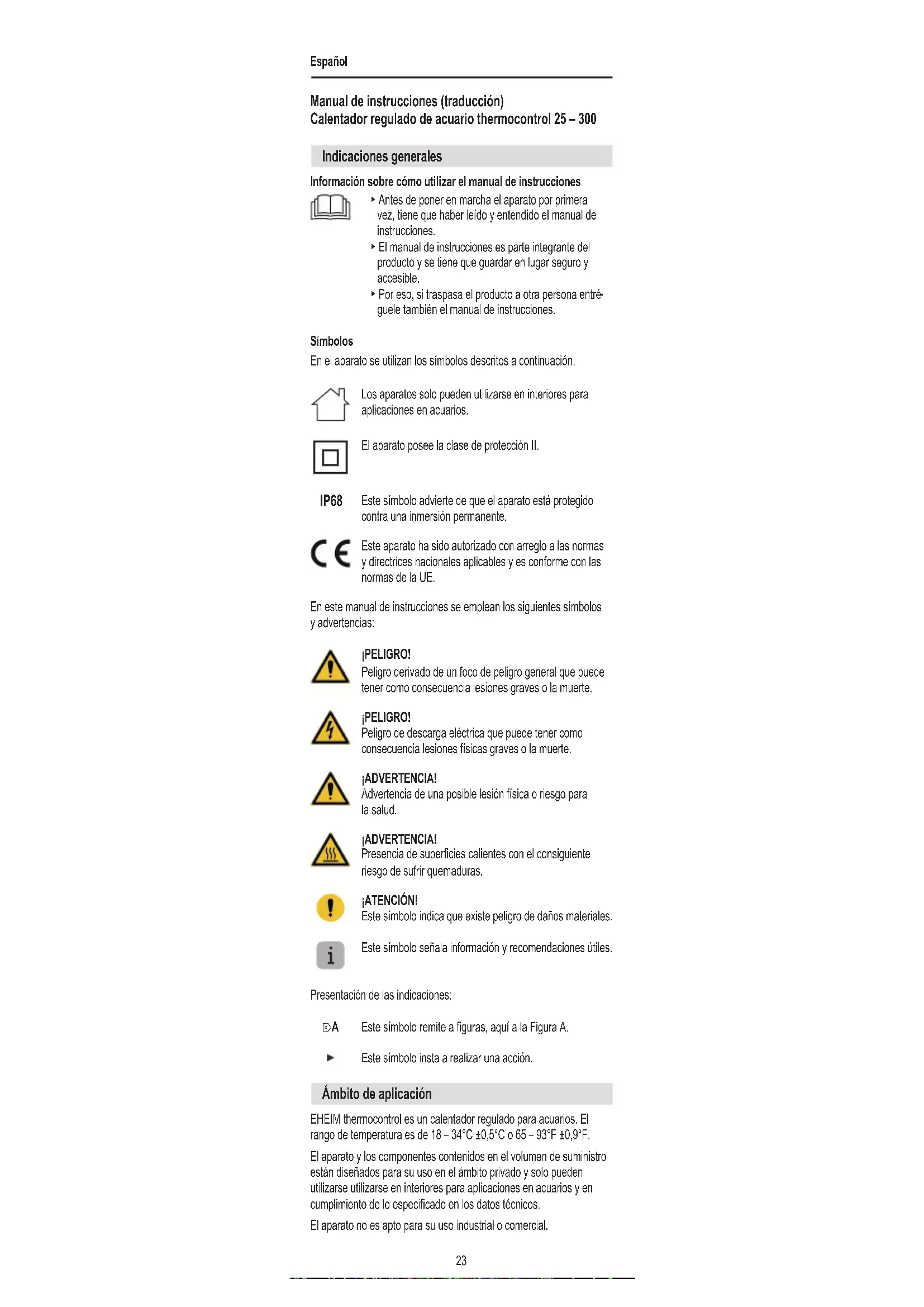 Manual de instrucciones (traducción) Calentador regulado de acuario thermocontrol 25 – 300 Indicaciones generales Información sobre cómo utilizar el manual de instrucciones ▶ Antes de poner en marcha el aparato por primera vez, tiene que haber leído y entendido el manual de instrucciones. ▶ El manual de instrucciones es parte integrante del producto y se tiene que guardar en lugar seguro y accesible. ▶ Por eso, si traspasa el producto a otra persona entré