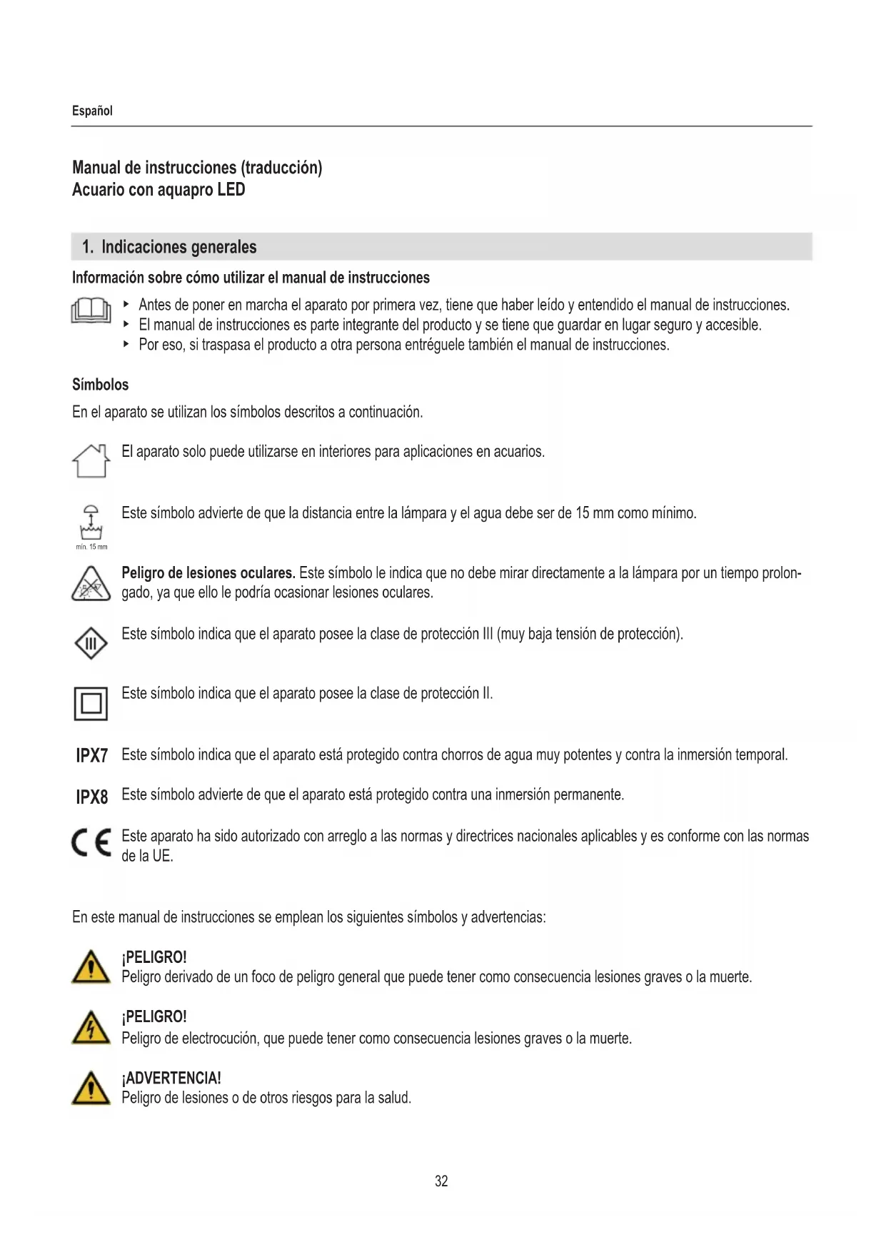 Información sobre cómo utilizar el manual de instrucciones ▶ Antes de poner en marcha el aparato por primera vez, tiene que haber leído y entendido el manual de instrucciones. ▶ El manual de instrucciones es parte integrante del producto y se tiene que guardar en lugar seguro y accesible. ▶ Por eso, si traspasa el producto a otra persona entréguele también el manual de instrucciones. Símbolos En el aparato se utilizan los símbolos descritos a continuación. El aparato solo puede utilizarse en interiores para aplicaciones en acuarios. Este símbolo advierte de que la distancia entre la lámpara y el agua debe ser de 15 mm como mínimo. Peligro de lesiones oculares. Este símbolo le indica que no debe mirar directamente a la lámpara por un tiempo prolon- gado, ya que ello le podría ocasionar lesiones oculares. Este símbolo indica que el aparato posee la clase de protección III (muy baja tensión de protección). Este símbolo indica que el aparato posee la clase de protección II. Este símbolo indica que el aparato está protegido contra chorros de agua muy potentes y contra la inmersión temporal. Este símbolo advierte de que el aparato está protegido contra una inmersión permanente. Este aparato ha sido autorizado con arreglo a las normas y directrices nacionales aplicables y es conforme con las normas de la UE. En este manual de instrucciones se emplean los siguientes símbolos y advertencias: ¡PELIGRO! Peligro derivado de un foco de peligro general que puede tener como consecuencia lesiones graves o la muerte. ¡PELIGRO! Peligro de electrocución, que puede tener como consecuencia lesiones graves o la muerte. ¡ADVERTENCIA! Peligro de lesiones o de otros riesgos para la salud. mín. 15 mm IPX7 IPX833 Español ¡ATENCIÓN! Este símbolo indica que existe peligro de daños materiales. Este símbolo señala información y recomendaciones útiles. Presentación de las indicaciones Este símbolo remite a guras, aquí la Figura A. Este símbolo insta a realizar una acción.