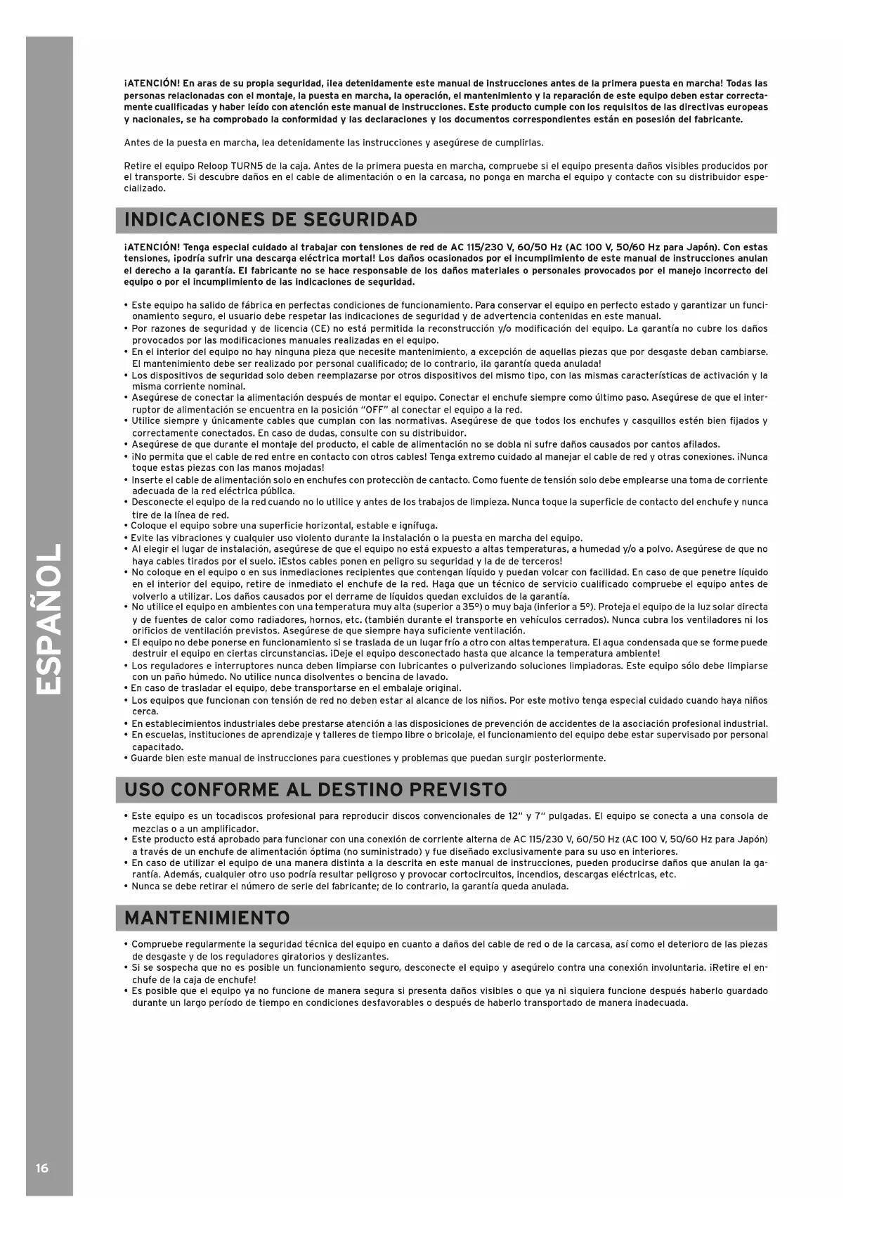 ¡ATENCIÓN! En aras de su propia seguridad, ¡lea detenidamente este manual de instrucciones antes de la primera puesta en marcha! Todas las personas relacionadas con el montaje, la puesta en marcha, la operación, el mantenimiento y la reparación de este equipo deben estar correcta- mente cualicadas y haber leído con atención este manual de instrucciones. Este producto cumple con los requisitos de las directivas europeas y nacionales, se ha comprobado la conformidad y las declaraciones y los documentos correspondientes están en posesión del fabricante. Antes de la puesta en marcha, lea detenidamente las instrucciones y asegúrese de cumplirlas. Retire el equipo Reloop TURN5 de la caja. Antes de la primera puesta en marcha, compruebe si el equipo presenta daños visibles producidos por el transporte. Si descubre daños en el cable de alimentación o en la carcasa, no ponga en marcha el equipo y contacte con su distribuidor espe- cializado.