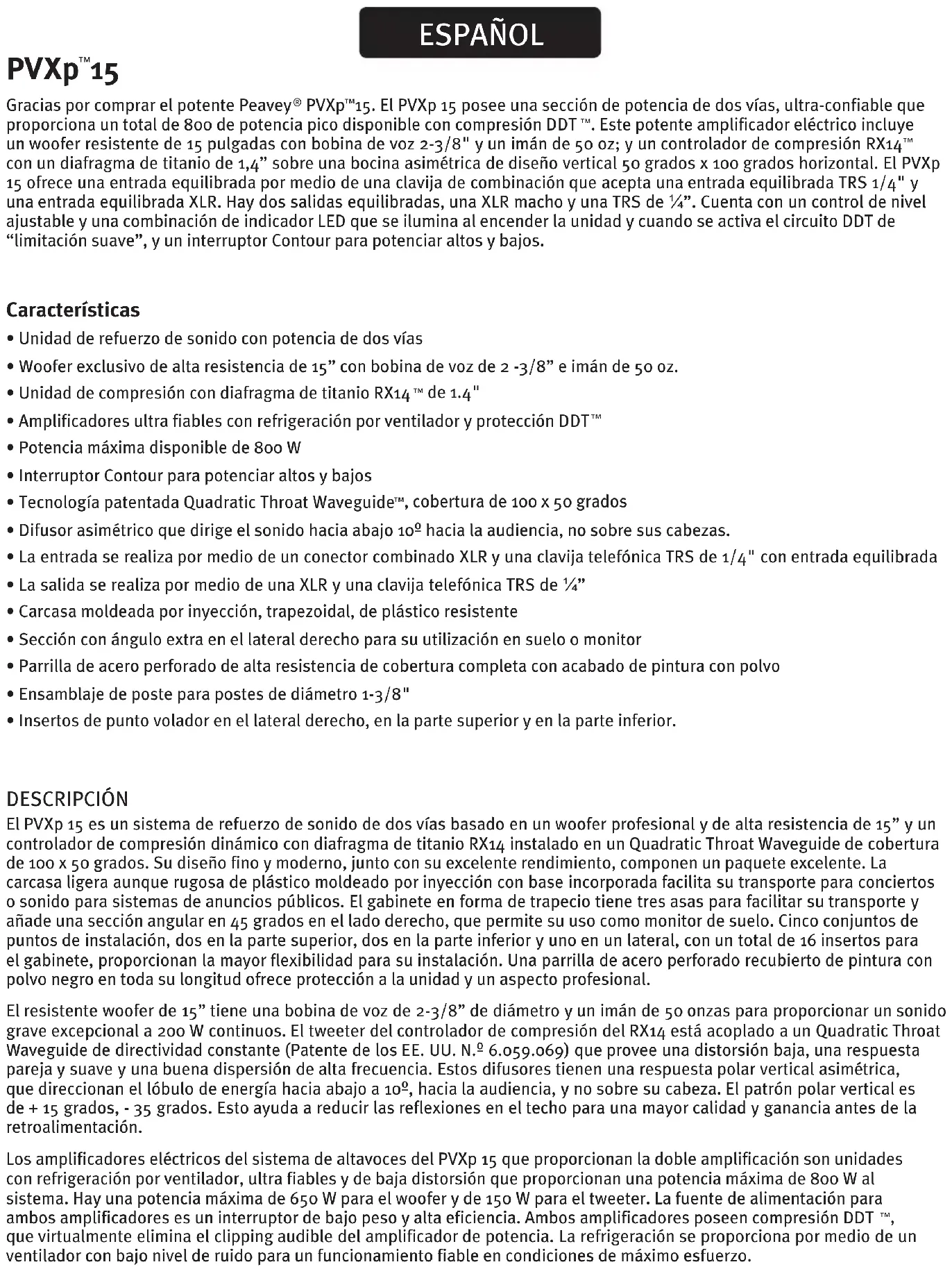 con un diafragma de titanio de 1,4” sobre una bocina asimétrica de diseño vertical 50 grados x 100 grados horizontal. El PVXp 15 ofrece una entrada equilibrada por medio de una clavija de combinación que acepta una entrada equilibrada TRS 1/4" y una entrada equilibrada XLR. Hay dos salidas equilibradas, una XLR macho y una TRS de ¼”. Cuenta con un control de nivel ajustable y una combinación de indicador LED que se ilumina al encender la unidad y cuando se activa el circuito DDT de “limitación suave”, y un interruptor Contour para potenciar altos y bajos. Características