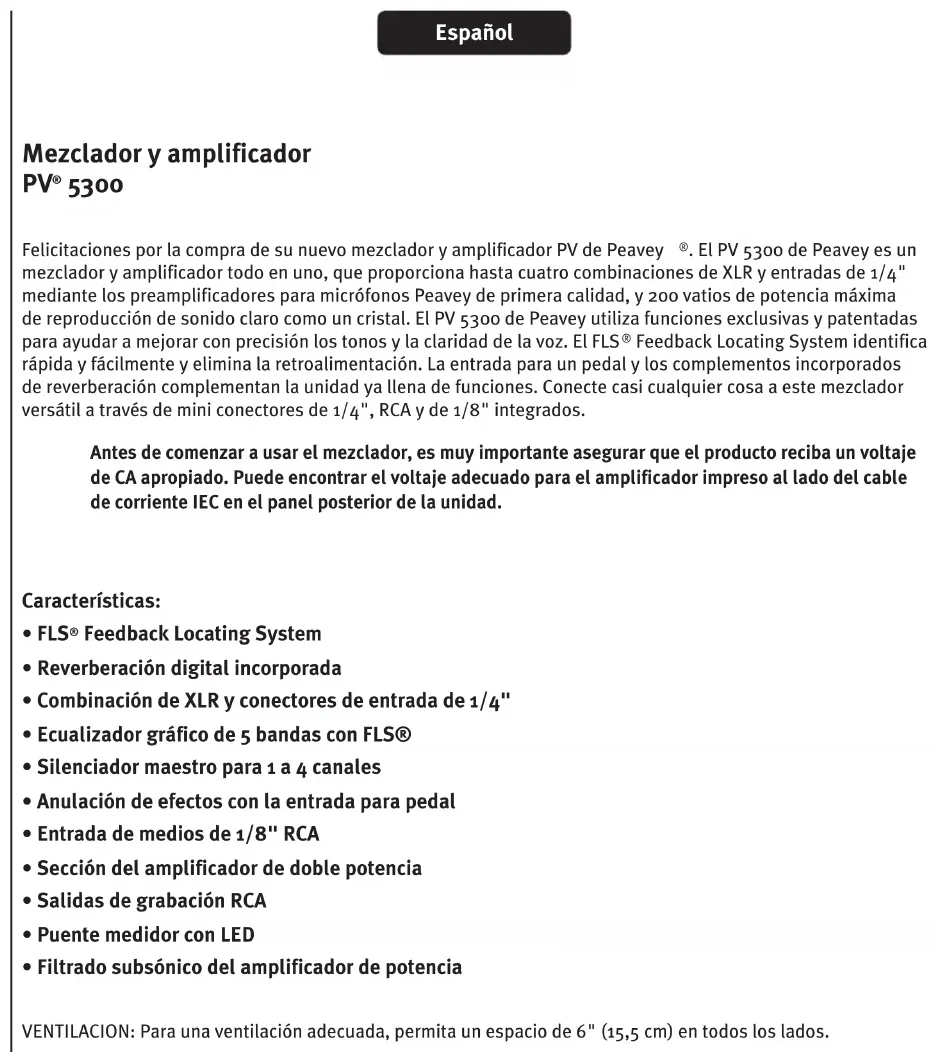 Felicitaciones por la compra de su nuevo mezclador y amplificador PV de Peavey ^® . El PV 5300 de Peavey es un mezclador y amplificador todo en uno, que proportionsc hasta quatre combinaciones de XLR y entradas de 1/4 mediate los preamplificadores para microfonos Peavey de prima calidad, y 200 varios de potencia maxima de reproduccion de sonido claro como un cristal. El PV 5300 de Peavey utilizelations exclusivas y patentadas para poder a mayorar con precision los tonos y la claridad de la voz. El FLS ^® Feedback Locating System identifica rapiida y fácilmente y elimina la retroalimentacion. La entrada para un pedal y los complementos incorporados de reverberacion complementan la unidad ya llena de functions. Conecte casiequalquercosa a este mezclador versatil a trovés de mini connectores de 1/4 , RCA y de 1/8 integrados.