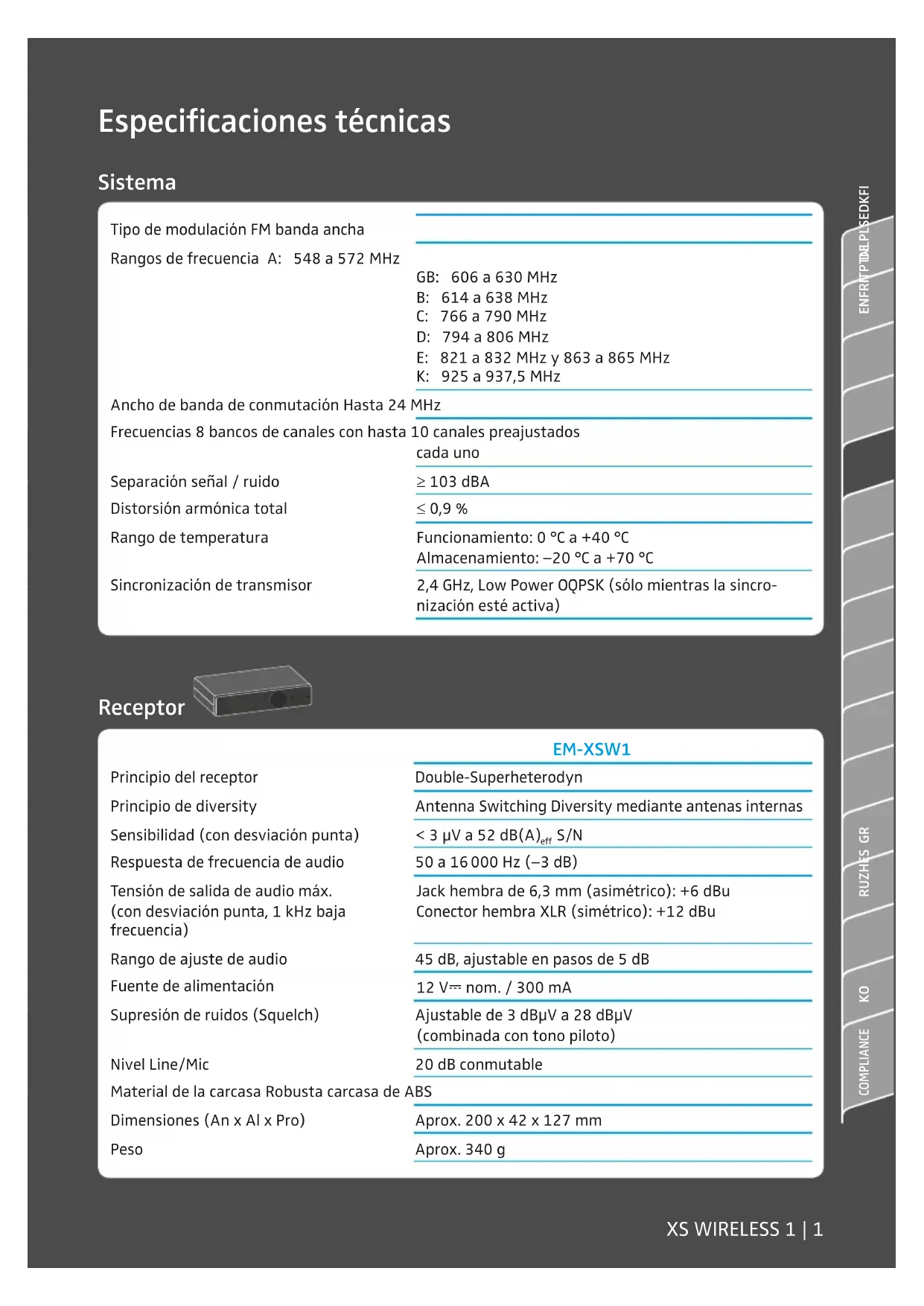 COMPLIANCE Especificaciones técnicas Tipo de modulación FM banda ancha Rangos de frecuencia A: 548 a 572 MHz GB: 606 a 630 MHz B: 614 a 638 MHz C: 766 a 790 MHz D: 794 a 806 MHz E: 821 a 832 MHz y 863 a 865 MHz K: 925 a 937,5 MHz Ancho de banda de conmutación Hasta 24 MHz Frecuencias 8 bancos de canales con hasta 10 canales preajustados cada uno Separación señal / ruido ≥ 103 dBA Distorsión armónica total ≤ 0,9 % Rango de temperatura Funcionamiento: 0 °C a +40 °C Almacenamiento: –20 °C a +70 °C Sincronización de transmisor 2,4 GHz, Low Power OQPSK (sólo mientras la sincro- nización esté activa) Sistema EM-XSW1 Principio del receptor Double-Superheterodyn Principio de diversity Antenna Switching Diversity mediante antenas internas Sensibilidad (con desviación punta) < 3 μV a 52 dB(A) eff S/N Respuesta de frecuencia de audio 50 a 16 000 Hz ( –3 dB) Tensión de salida de audio máx. (con desviación punta, 1 kHz baja frecuencia) Jack hembra de 6,3 mm (asimétrico): +6 dBu Conector hembra XLR (simétrico): +12 dBu Rango de ajuste de audio 45 dB, ajustable en pasos de 5 dB Fuente de alimentación 12 V⎓ nom. / 300 mA Supresión de ruidos (Squelch) Ajustable de 3 dBμV a 28 dBμV (combinada con tono piloto) Nivel Line/Mic 20 dB conmutable Material de la carcasa Robusta carcasa de ABS Dimensiones (An x Al x Pro) Aprox. 200 x 42 x 127 mm Peso Aprox. 340 g Receptor2 | XS WIRELESS 1 Transmisor SK-XSW SKM-XSW e 825 e 835 Potencia de salida de RF 10 mW Respuesta de frecuencia de audio 50 a 16000 Hz (Line) 80 a 16000 Hz (Mic) 80 a 14000 Hz 80 a 16000 Hz Entrada de audio Jack hembra de 3,5 mm – Tensión máx. de entrada (Mic/Line) con 3 % de distorsión armónica típ. 1,5 V RMS Mic/ típ. 2,6 V RMS Line @ –30 dB de ganancia