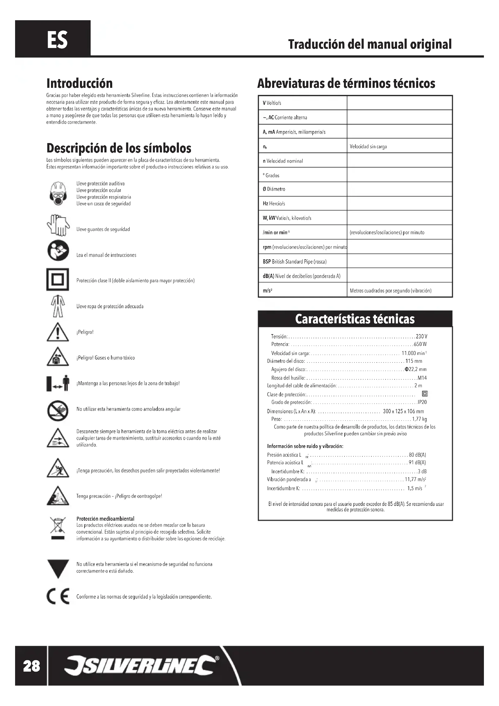 Diámetro del disco: ............................................115 mm Agujero del disco:............................................Φ22,2 mm Rosca del husillo: . . . . . . . . . . . . . . . . . . . . . . . . . . . . . . . . . . . . . . . . . . . . . . . . . .M14 Longitud del cable de alimentación: . . . . . . . . . . . . . . . . . . . . . . . . . . . . . . . . . . 2 m Clase de protección:................................................. Grado de protección: ...............................................IP20 Dimensiones (L x An x A): ............................ 300 x 125 x 106 mm Peso: .........................................................1,77 kg Como parte de nuestra política de desarrollo de productos, los datos técnicos de los productos Silverline pueden cambiar sin previo aviso Información sobre ruido y vibración: Presión acústica L : ............................................80 dB(A) Potencia acústica L :...........................................91 dB(A) Incertidumbre K: ..................................................3 dB Vibración ponderada a : ......................................11,77 m/s Incertidumbre K: .............................................. 1,5 m/s El nivel de intensidad sonora para el usuario puede exceder de 85 dB(A). Se recomienda usar medidas de protección sonora. Características técnicas 571295/980109_Manual.indd 28 01/07/2019 14:13Amoladora angular 650 W