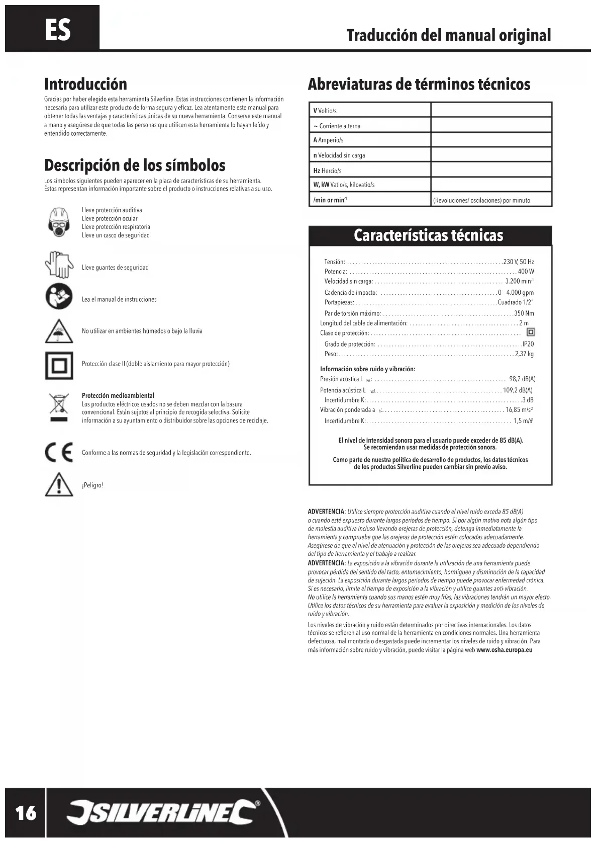 ADVERTENCIA: Utilice siempre protección auditiva cuando el nivel ruido exceda 85 dB(A) o cuando esté expuesto durante largos periodos de tiempo. Si por algún motivo nota algún tipo de molestia auditiva incluso llevando orejeras de protección, detenga inmediatamente la herramienta y compruebe que las orejeras de protección estén colocadas adecuadamente. Asegúrese de que el nivel de atenuación y protección de las orejeras sea adecuado dependiendo del tipo de herramienta y el trabajo a realizar. ADVERTENCIA: La exposición a la vibración durante la utilización de una herramienta puede provocar pérdida del sentido del tacto, entumecimiento, hormigueo y disminución de la capacidad de sujeción. La exposición durante largos periodos de tiempo puede provocar enfermedad crónica. Si es necesario, limite el tiempo de exposición a la vibración y utilice guantes anti-vibración. No utilice la herramienta cuando sus manos estén muy frías, las vibraciones tendrán un mayor efecto. Utilice los datos técnicos de su herramienta para evaluar la exposición y medición de los niveles de ruido y vibración.Los niveles de vibración y ruido están determinados por directivas internacionales. Los datos técnicos se reeren al uso normal de la herramienta en condiciones normales. Una herramienta defectuosa, mal montada o desgastada puede incrementar los niveles de ruido y vibración. Para más información sobre ruido y vibración, puede visitar la página web www.osha.europa.eu Traducción del manual original Abreviaturas de términos técnicos Descripción de los símbolos Los símbolos siguientes pueden aparecer en la placa de características de su herramienta. Éstos representan información importante sobre el producto o instrucciones relativas a su uso.Lleve protección auditivaLleve protección ocularLleve protección respiratoriaLleve un casco de seguridadLleve guantes de seguridadLea el manual de instruccionesNo utilizar en ambientes húmedos o bajo la lluviaProtección clase II (doble aislamiento para mayor protección)Protección medioambiental Los productos eléctricos usados no se deben mezclar con la basura convencional. Están sujetos al principio de recogida selectiva. Solicite información a su ayuntamiento o distribuidor sobre las opciones de reciclaje.Conforme a las normas de seguridad y la legislación correspondiente.¡Peligro! Introducción Gracias por haber elegido esta herramienta Silverline. Estas instrucciones contienen la información necesaria para utilizar este producto de forma segura y ecaz. Lea atentamente este manual para obtener todas las ventajas y características únicas de su nueva herramienta. Conserve este manual a mano y asegúrese de que todas las personas que utilicen esta herramienta lo hayan leído y entendido correctamente.