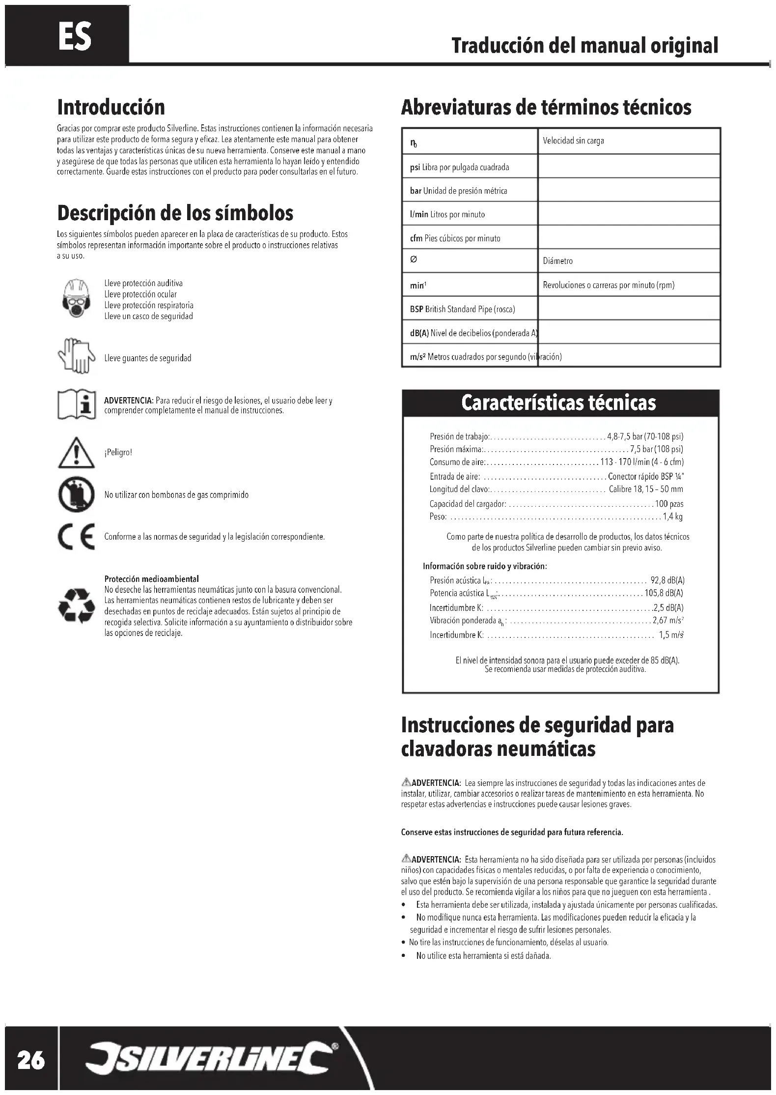 Elniveldeintensidadsonoraparaelusuariopuedeexcederde85dB(A). Se recomienda usar medidas de protección auditiva. Introducción GraciasporcompraresteproductoSilverline.Estasinstruccionescontienenlainformaciónnecesariaparautilizaresteproductodeformasegurayecaz.Leaatentamenteestemanualparaobtenertodaslasventajasycaracterísticasúnicasdesunuevaherramienta.Conserveestemanualamanoyasegúresedequetodaslaspersonasqueutilicenestaherramientalohayanleídoyentendidocorrectamente. Guarde estas instrucciones con el producto para poder consultarlas en el futuro. Características técnicas Abreviaturas de términos técnicos