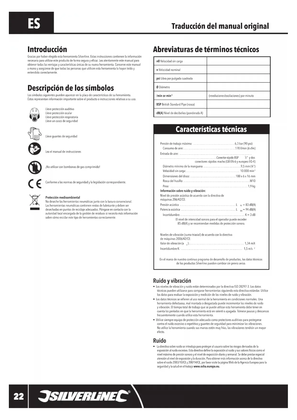 - La directiva sobre ruido se introdujo para proteger al usuario sobre los riesgos derivados de la exposiciónalruidoexcesivo.Estadirectivadenelaexposiciónalruidoysusvaloresfísicoscomoelnivel máximo de presión sonora y el nivel de exposición diario y semanal. Se debe prestar especial atención al nivel de exposición y la duración. Para obtener más información acerca de la directiva sobre el ruido 2003/10/CE y 200/14/CE, por favor visite la página Web de la Agencia Europea para la seguridad y la salud en el trabajo www.osha.europa.eu. Traducción del manual original Abreviaturas de términos técnicos Descripción de los símbolos Los símbolos siguientes pueden aparecer en la placa de características de su herramienta. Éstos representan información importante sobre el producto o instrucciones relativas a su uso.Lleve protección auditivaLleve protección ocularLleve protección respiratoriaLleve un casco de seguridadLleve guantes de seguridadLea el manual de instrucciones¡Noutilizarconbombonasdegascomprimido!Conforme a las normas de seguridad y la legislación correspondiente.Protección medioambiental No deseche las herramientas neumáticas junto con la basura convencional. Las herramientas neumáticas contienen restos de lubricante y deben ser desechadas en puntos de reciclaje adecuados. Póngase en contacto con la autoridad local encargada de la gestión de residuos si necesita más información sobre cómo reciclar este tipo de herramientas correctamente.n0 Velocidad sin cargan Velocidad nominalpsi Libra por pulgada cuadradaØ Diámetro/min or min (revoluciones/oscilaciones) por minutoBSP British Standard Pipe (rosca)dB(A) Nivel de decibelios (ponderada A) Introducción Gracias por haber elegido esta herramienta Silverline. Estas instrucciones contienen la información necesariaparautilizaresteproductodeformasegurayecaz.Leaatentamenteestemanualparaobtener todas las ventajas y características únicas de su nueva herramienta. Conserve este manual a mano y asegúrese de que todas las personas que utilicen esta herramienta lo hayan leído y entendido correctamente. Características técnicas Características técnicas Presión de trabajo máxima: ...............................6,3 bar (90 psi) Consumo de aire:.......................................170 l/min (6 cfm) Entrada de aire: ...................................................... . . . . . . . . . . . . . . . . . . . . . . . . . . . . . . . . . . . . . . . . . . . . . .Conector rápido BSP ⁄4" y dos conectores rápidos macho (GB EN-6 y europeo EQ-4) Diámetro mínimo de la manguera: ............................9,5 mm (