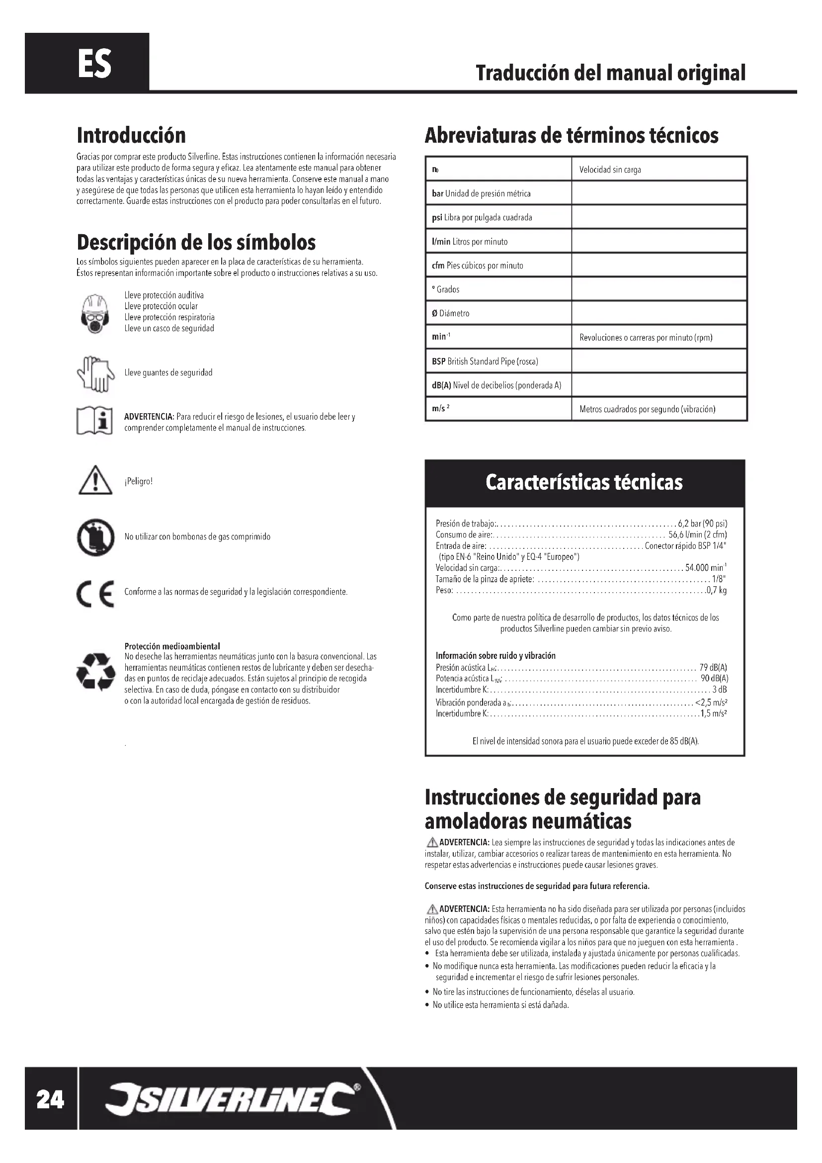 Metros cuadrados por segundo (vibración) Introducción Gracias por comprar este producto Silverline. Estas instrucciones contienen la información necesaria parautilizaresteproductodeformasegurayecaz.Leaatentamenteestemanualparaobtenertodas las ventajas y características únicas de su nueva herramienta. Conserve este manual a mano y asegúrese de que todas las personas que utilicen esta herramienta lo hayan leído y entendido correctamente. Guarde estas instrucciones con el producto para poder consultarlas en el futuro.