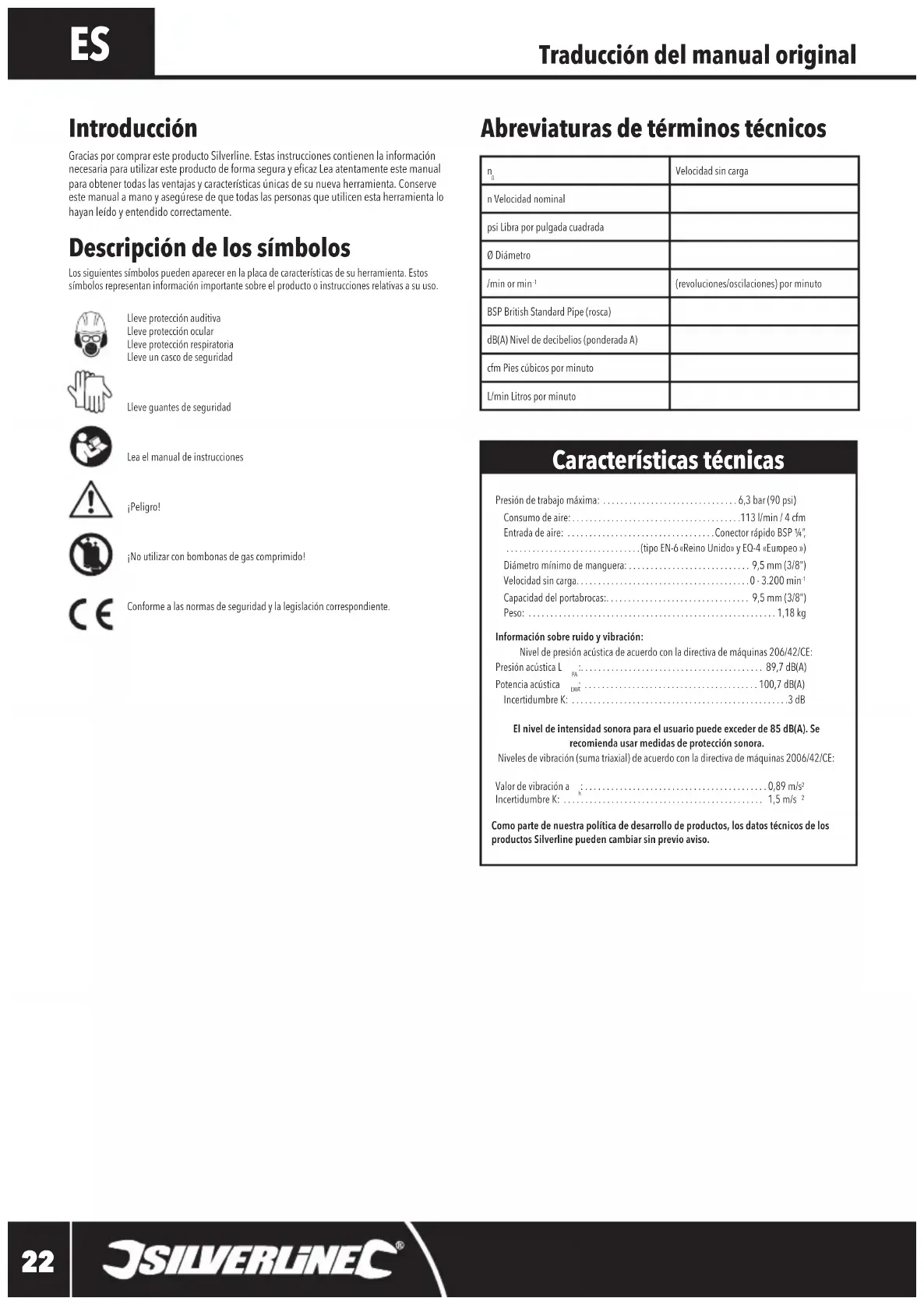 Como parte de nuestra política de desarrollo de productos, los datos técnicos de los productos Silverline pueden cambiar sin previo aviso. Introducción Gracias por comprar este producto Silverline. Estas instrucciones contienen la información necesaria para utilizar este producto de forma segura y eficaz Lea atentamente este manual para obtener todas las ventajas y características únicas de su nueva herramienta. Conserve este manual a mano y asegúrese de que todas las personas que utilicen esta herramienta lo hayan leído y entendido correctamente.