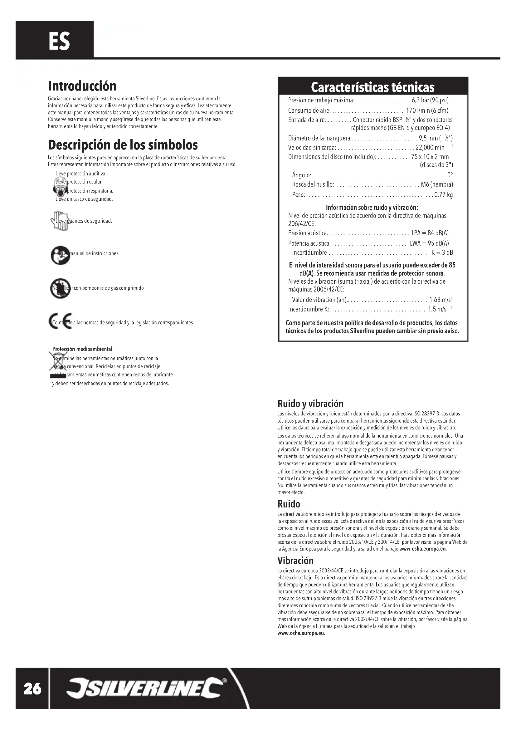 Ruido y vibración Los niveles de vibración y ruido están determinados por la directiva ISO 28297-3. Los datos técnicos pueden utilizarse para comparar herramientas siguiendo esta directiva estándar. Utilice los datos para evaluar la exposición y medición de los niveles de ruido y vibración.Los datos técnicos se reeren al uso normal de la herramienta en condiciones normales. Una herramienta defectuosa, mal montada o desgastada puede incrementar los niveles de ruido y vibración. El tiempo total de trabajo que se puede utilizar esta herramienta debe tener en cuenta los períodos en que la herramienta está en ralentí o apagada. Tómese pausas y descansos frecuentemente cuando utilice esta herramienta.Utilice siempre equipo de protección adecuado como protectores auditivos para protegerse contra el ruido excesivo o repetitivo y guantes de seguridad para minimizar las vibraciones. No utilice la herramienta cuando sus manos estén muy frías, las vibraciones tendrán un mayor efecto. Ruido La directiva sobre ruido se introdujo para proteger al usuario sobre los riesgos derivados de la exposición al ruido excesivo. Esta directiva dene la exposición al ruido y sus valores físicos como el nivel máximo de presión sonora y el nivel de exposición diario y semanal. Se debe prestar especial atención al nivel de exposición y la duración. Para obtener más información acerca de la directiva sobre el ruido 2003/10/CE y 200/14/CE, por favor visite la página Web de la Agencia Europea para la seguridad y la salud en el trabajo www.osha.europa.eu. Vibración La directiva europea 2002/44/CE se introdujo para controlar la exposición a las vibraciones en el área de trabajo. Esta directiva permite mantener a los usuarios informados sobre la cantidad de tiempo que pueden utilizar una herramienta. Los usuarios que regularmente utilizan herramientas con alto nivel de vibración durante largos periodos de tiempo tienen un riesgo más alto de sufrir problemas de salud. ISO 28927-3 mide la vibración en tres direcciones diferentes conocida como suma de vectores triaxial. Cuando utilice herramientas de alta vibración debe asegurarse de no sobrepasar el tiempo de exposición máximo. Para obtener más información acerca de la directiva 2002/44/CE sobre la vibración, por favor visite la página Web de la Agencia Europea para la seguridad y la salud en el trabajo www.osha.europa.eu. Características técnicas Presión de trabajo máxima:.................... 6,3 bar (90 psi) Consumo de aire: .......................... 170 l/min (6 cfm) Entrada de aire: . . . . . . . . . Conector rápido BSP