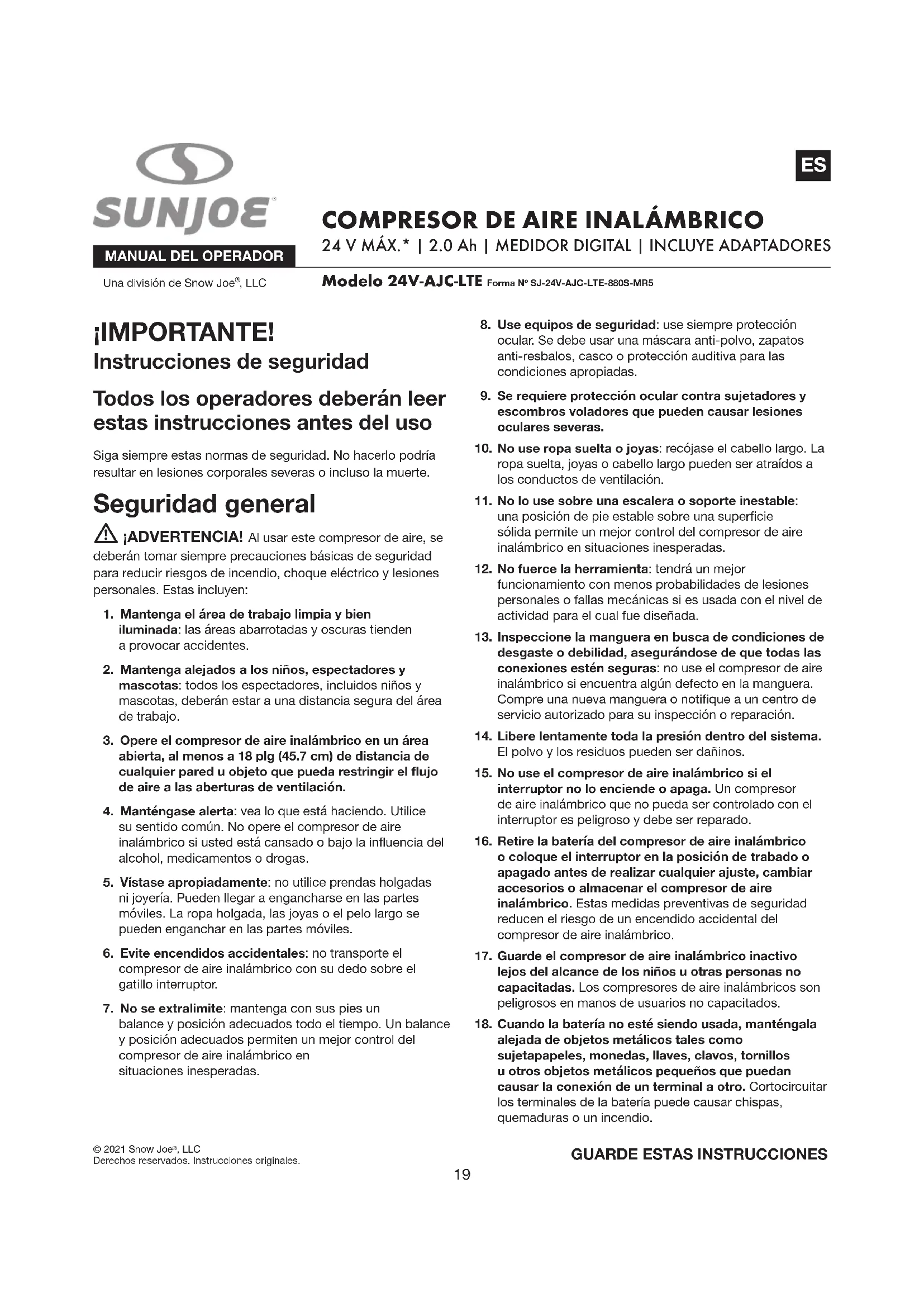 y, si se encuentran daños, repare los cables en su centro de servicio autorizado más cercano. Esté siempre atento de dónde se encuentra el cable. Seguir esta regla reducirá el riesgo de un choque eléctrico o incendio. m ¡ADVERTENCIA! No use este compresor de aire inalámbrico sin antes leer este manual de instrucciones. Solo para uso en interiores. Instrucciones de seguridad para la batería y el cargador Prestamos mucha atención al diseño de cada batería para garantizar la producción de baterías seguras y durables, con una alta densidad de energía. Las celdas de la batería tienen una amplia gama de dispositivos de seguridad. Cada celda individual es inicialmente formateada y se registran sus curvas eléctricas características. Estos datos son luego usados exclusivamente para poder ensamblar las mejores baterías posibles. Independientemente de todas las precauciones de seguridad, se debe tener mucho cuidado al manipular las baterías. Las siguientes instrucciones deben ser obedecidas en todo momento para garantizar un uso seguro. Un uso seguro solo puede ser garantizado si se usan celdas libres de daños. Una manipulación incorrecta de la batería puede causar daños en las celdas. ¡IMPORTANTE! Los análisis han conrmado que el uso incorrecto y el cuidado deciente de baterías de alto rendimiento son las causas principales de lesiones personales y/o daños al producto. m ¡ADVERTENCIA! Use solo baterías de repuesto aprobadas. Otras baterías pueden dañar la herramienta eléctrica y provocar un desperfecto que pueda causar lesiones personales severas. m ¡ADVERTENCIA! No use una batería o artefacto que hayan sido dañados o modicados. Las baterías dañadas o modicadas pueden reaccionar de forma impredecible, causando un incendio, explosión, o riesgo de lesiones. No modique ni intente reparar el artefacto o la batería, a menos que lo haga según lo indicado en las instrucciones de uso y cuidado. Su batería deberá ser reparada por una persona calicada usando únicamente partes de repuesto originales. Esto mantendrá la seguridad de la batería. m ¡PRECAUCIÓN! Para reducir el riesgo de lesiones, cargue la batería de iones de litio de 24 V Sun Joe