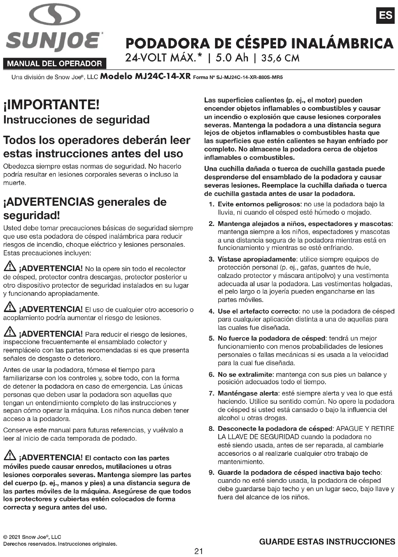 24-VOLT MÁX.* | 5.0 Ah | 35,6 CM ¡IMPORTANTE! Instrucciones de seguridad Todos los operadores deberán leer estas instrucciones antes del uso Obedezca siempre estas normas de seguridad. No hacerlo podría resultar en lesiones corporales severas o incluso la muerte. ¡ADVERTENCIAS generales de seguridad! Usted debe tomar precauciones básicas de seguridad siempre que use esta podadora de césped inalámbrica para reducir riesgos de incendio, choque eléctrico y lesiones personales. Estas precauciones incluyen: m ¡ADVERTENCIA! No la opere sin todo el recolector de césped, protector contra descargas, protector posterior u otro dispositivo protector de seguridad instalados en su lugar y funcionando apropiadamente. m ¡ADVERTENCIA! El uso de cualquier otro accesorio o acoplamiento podría aumentar el riesgo de lesiones. m ¡ADVERTENCIA! Para reducir el riesgo de lesiones, inspeccione frecuentemente el ensamblado colector y reemplácelo con las partes recomendadas si es que presenta señales de desgaste o deterioro. Antes de usar la podadora, tómese el tiempo para familiarizarse con los controles y, sobre todo, con la forma de detener la podadora en caso de emergencia. Las únicas personas que deben usar la podadora son aquellas que tengan un entendimiento completo de las instrucciones y sepan cómo operar la máquina. Los niños nunca deben tener acceso a la podadora. Conserve este manual para futuras referencias, y vuélvalo a leer al inicio de cada temporada de podado. m ¡ADVERTENCIA! El contacto con las partes móviles puede causar enredos, mutilaciones u otras lesiones corporales severas. Mantenga siempre las partes del cuerpo (p. ej., manos y pies) a una distancia segura de las partes móviles de la máquina. Asegúrese de que todos los protectores y cubiertas estén colocados de forma correcta y segura antes del uso. Las supercies calientes (p. ej., el motor) pueden encender objetos inamables o combustibles y causar un incendio o explosión que cause lesiones corporales severas. Mantenga la podadora a una distancia segura lejos de objetos inamables o combustibles hasta que las supercies que estén calientes se hayan enfriado por completo. No almacene la podadora cerca de objetos inamables o combustibles. Una cuchilla dañada o tuerca de cuchilla gastada puede desprenderse del ensamblado de la podadora y causar severas lesiones. Reemplace la cuchilla dañada o tuerca de cuchilla gastada antes de usar la podadora.