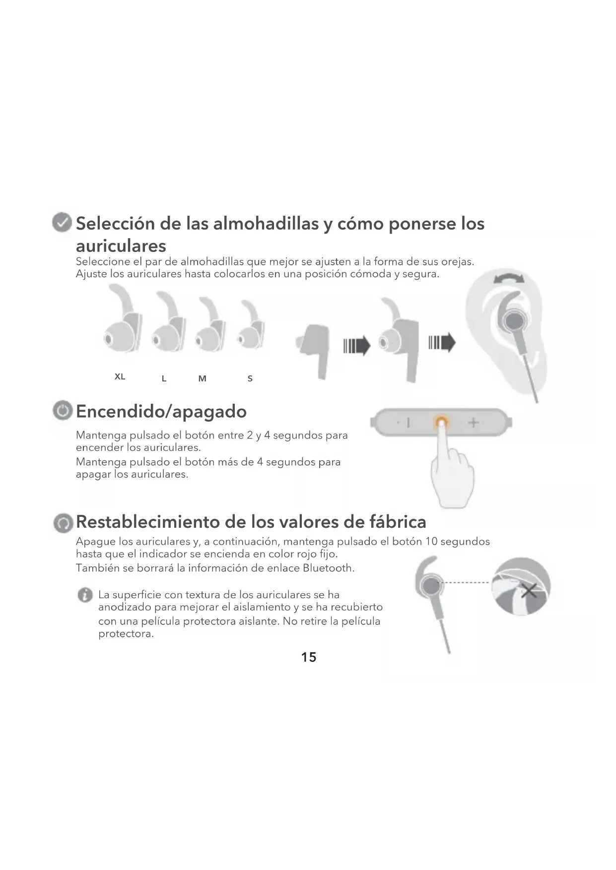 Selección de las almohadillas y cómo ponerse los auriculares Seleccione el par de almohadillas que mejor se ajusten a la forma de sus orejas. Ajuste los auriculares hasta colocarlos en una posición cómoda y segura. Encendido/apagado Restablecimiento de los valores de fábrica Mantenga pulsado el botón entre 2 y 4 segundos para encender los auriculares. Mantenga pulsado el botón más de 4 segundos para apagar los auriculares. Apague los auriculares y, a continuación, mantenga pulsado el botón 10 segundos hasta que el indicador se encienda en color rojo fijo. También se borrará la información de enlace Bluetooth.