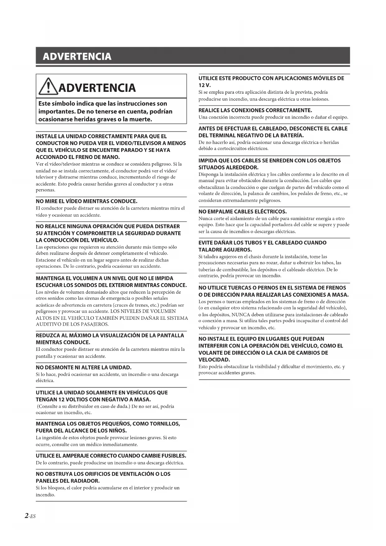 - Especificaciones ALPINE iLX-F905D 68-41657Z79-B_QRG (ES) ALPINE iLX-F905D 68-41657Z79-B_QRG (ES) 2-ES ADVERTENCIA ADVERTENCIA Este símbolo indica que las instrucciones son importantes. De no tenerse en cuenta, podrían ocasionarse heridas graves o la muerte. INSTALE LA UNIDAD CORRECTAMENTE PARA QUE EL CONDUCTOR NO PUEDA VER EL VIDEO/TELEVISOR A MENOS QUE EL VEHÍCULO SE ENCUENTRE PARADO Y SE HAYA ACCIONADO EL FRENO DE MANO.Ver el vídeo/televisor mientras se conduce se considera peligroso. Si la unidad no se instala correctamente, el conductor podrá ver el vídeo/televisor y distraerse mientras conduce, incrementando el riesgo de accidente. Esto podría causar heridas graves al conductor y a otras personas.NO MIRE EL VÍDEO MIENTRAS CONDUCE.El conductor puede distraer su atención de la carretera mientras mira el vídeo y ocasionar un accidente.NO REALICE NINGUNA OPERACIÓN QUE PUEDA DISTRAER SU ATENCIÓN Y COMPROMETER LA SEGURIDAD DURANTE LA CONDUCCIÓN DEL VEHÍCULO.Las operaciones que requieren su atención durante más tiempo sólo deben realizarse después de detener completamente el vehículo. Estacione el vehículo en un lugar seguro antes de realizar dichas operaciones. De lo contrario, podría ocasionar un accidente.MANTENGA EL VOLUMEN A UN NIVEL QUE NO LE IMPIDA ESCUCHAR LOS SONIDOS DEL EXTERIOR MIENTRAS CONDUCE.Los niveles de volumen demasiado altos que reducen la percepción de otros sonidos como las sirenas de emergencia o posibles señales acústicas de advertencia en carretera (cruces de trenes, etc.) podrían ser peligrosos y provocar un accidente. LOS NIVELES DE VOLUMEN ALTOS EN EL VEHÍCULO TAMBIÉN PUEDEN DAÑAR EL SISTEMA AUDITIVO DE LOS PASAJEROS.REDUZCA AL MÁXIMO LA VISUALIZACIÓN DE LA PANTALLA MIENTRAS CONDUCE.El conductor puede distraer su atención de la carretera mientras mira la pantalla y ocasionar un accidente.NO DESMONTE NI ALTERE LA UNIDAD.Si lo hace, podrá ocasionar un accidente, un incendio o una descarga eléctrica.UTILICE LA UNIDAD SOLAMENTE EN VEHÍCULOS QUE TENGAN 12 VOLTIOS CON NEGATIVO A MASA. (Consulte a su distribuidor en caso de duda.) De no ser así, podría ocasionar un incendio, etc.MANTENGA LOS OBJETOS PEQUEÑOS, COMO TORNILLOS, FUERA DEL ALCANCE DE LOS NIÑOS.La ingestión de estos objetos puede provocar lesiones graves. Si esto ocurre, consulte con un médico inmediatamente.UTILICE EL AMPERAJE CORRECTO CUANDO CAMBIE FUSIBLES.De lo contrario, puede producirse un incendio o una descarga eléctrica.NO OBSTRUYA LOS ORIFICIOS DE VENTILACIÓN O LOS PANELES DEL RADIADOR.Si los bloquea, el calor podría acumularse en el interior y producir un incendio.UTILICE ESTE PRODUCTO CON APLICACIONES MÓVILES DE 12 V.Si se emplea para otra aplicación distinta de la prevista, podría producirse un incendio, una descarga eléctrica u otras lesiones.REALICE LAS CONEXIONES CORRECTAMENTE.Una conexión incorrecta puede producir un incendio o dañar el equipo.ANTES DE EFECTUAR EL CABLEADO, DESCONECTE EL CABLE DEL TERMINAL NEGATIVO DE LA BATERÍA.De no hacerlo así, podría ocasionar una descarga eléctrica o heridas debido a cortocircuitos eléctricos.IMPIDA QUE LOS CABLES SE ENREDEN CON LOS OBJETOS SITUADOS ALREDEDOR.Disponga la instalación eléctrica y los cables conforme a lo descrito en el manual para evitar obstáculos durante la conducción. Los cables que obstaculizan la conducción o que cuelgan de partes del vehículo como el volante de dirección, la palanca de cambios, los pedales de freno, etc., se consideran extremadamente peligrosos.NO EMPALME CABLES ELÉCTRICOS.Nunca corte el aislamiento de un cable para suministrar energía a otro equipo. Esto hace que la capacidad portadora del cable se supere y puede ser la causa de incendios o descargas eléctricas.EVITE DAÑAR LOS TUBOS Y EL CABLEADO CUANDO TALADRE AGUJEROS.Si taladra agujeros en el chasis durante la instalación, tome las precauciones necesarias para no rozar, dañar u obstruir los tubos, las tuberías de combustible, los depósitos o el cableado eléctrico. De lo contrario, podría provocar un incendio.NO UTILICE TUERCAS O PERNOS EN EL SISTEMA DE FRENOS O DE DIRECCIÓN PARA REALIZAR LAS CONEXIONES A MASA.Los pernos o tuercas empleados en los sistemas de freno o de dirección (o en cualquier otro sistema relacionado con la seguridad del vehículo), o los depósitos, NUNCA deben utilizarse para instalaciones de cableado o conexión a masa. Si utiliza tales partes podrá incapacitar el control del vehículo y provocar un incendio, etc.NO INSTALE EL EQUIPO EN LUGARES QUE PUEDAN INTERFERIR CON LA OPERACIÓN DEL VEHÍCULO, COMO EL VOLANTE DE DIRECCIÓN O LA CAJA DE CAMBIOS DE VELOCIDAD.Esto podría obstaculizar la visibilidad y dificultar el movimiento, etc. y provocar accidentes graves. PRUDENCIA Este símbolo indica que las instrucciones son importantes. De no tenerse en cuenta, podría ocasionarse heridas graves o daños materiales. DEJE DE USAR LA UNIDAD INMEDIATAMENTE SI APARECE ALGÚN PROBLEMA. Su uso en estas condiciones podría ocasionar lesiones personales o daños al producto. Lleve la unidad a un distribuidor Alpine autorizado o al Centro de servicio Alpine más próximo para repararla. CONFÍE EL CABLEADO Y LA INSTALACIÓN A PROFESIONALES. El cableado y la instalación de este equipo requieren una competencia y experiencia técnica confirmada. Para garantizar la seguridad, póngase siempre en contacto con el distribuidor al que ha comprado el equipo para confiarle estas tareas. UTILICE LOS ACCESORIOS ESPECIFICADOS E INSTÁLELOS CORRECTAMENTE. Asegúrese de utilizar los accesorios especificados solamente. La utilización de otras piezas no designadas puede ser la causa de daños en el interior de la unidad o de una instalación incorrecta. Las piezas pueden aflojarse, lo que, además de ser peligroso, puede provocar averías. DISPONGA EL CABLEADO DE FORMA QUE LOS CABLES NO SE DOBLEN, NO SE CONTRAIGAN NI ROCEN UN BORDE METÁLICO AFILADO. Aleje los cables y el cableado de piezas mó