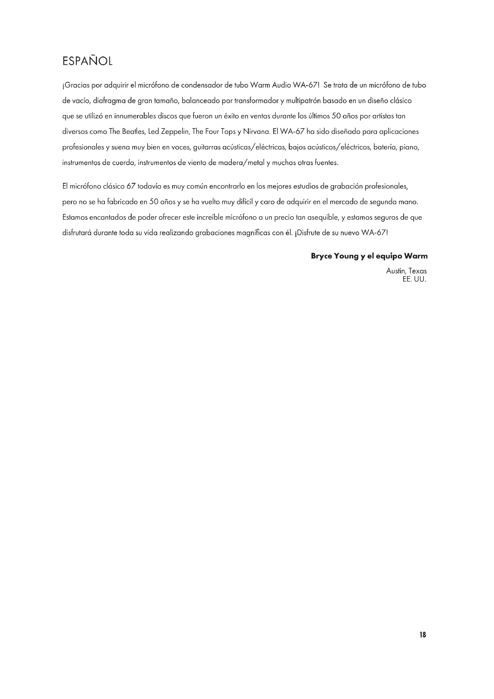 jGracias por adquirir el micrófono de condensador de tubo Warm Audio WA-67! Se tratate de un micrófono de tubo de vacio, diafragma de gran時間, balanceado por transformador y multipatron bajo en un Diseño clásico que se realizó en innumerable discos que fueon un exito en Ventas durante los ultimos 50 años por artistas tan diversos como The Beatles, Led Zeppelin, The Four Tops y Nirvana. El WA-67 ha sido diseñado para aplicaciones profesionales y suena muy bien en voces, gutarras acústicas/électricas, bajo acústicos/electricos, batería, piano, instrumentos de cierra, instrumentos de viento de madera/metal y muchas otheras fuentes.