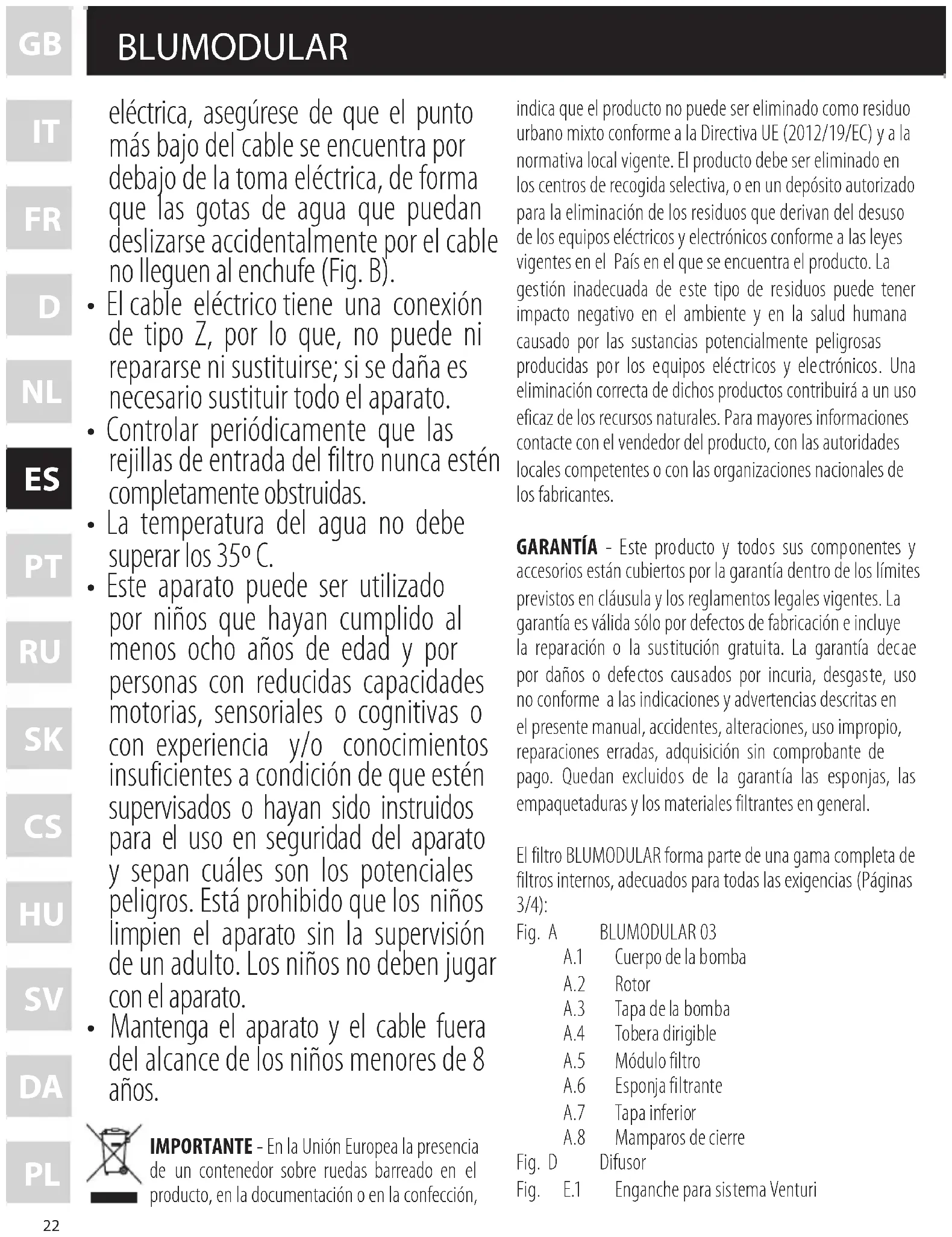 - Mantenga el aparato y el cable fuera del alcance de los niños menores de 8 años. IMPORTANTE - En la Unión Europea la presencia de un contenedor sobre ruedas barreado en el producto, en la documentación o en la confección, indica que el producto no puede ser eliminado como residuo urbano mixto conforme a la Directiva UE (2012/19/EC) y a la normativa local vigente. El producto debe ser eliminado en los centros de recogida selectiva, o en un depósito autorizado para la eliminación de los residuos que derivan del desuso de los equipos eléctricos y electrónicos conforme a las leyes vigentes en el País en el que se encuentra el producto. La gestión inadecuada de este tipo de residuos puede tener impacto negativo en el ambiente y en la salud humana causado por las sustancias potencialmente peligrosas producidas por los equipos eléctricos y electrónicos. Una eliminación correcta de dichos productos contribuirá a un uso eficaz de los recursos naturales. Para mayores informaciones contacte con el vendedor del producto, con las autoridades locales competentes o con las organizaciones nacionales de los fabricantes. GARANTÍA - Este producto y todos sus componentes y accesorios están cubiertos por la garantía dentro de los límites previstos en cláusula y los reglamentos legales vigentes. La garantía es válida sólo por defectos de fabricación e incluye la reparación o la sustitución gratuita. La garantía decae por daños o defectos causados por incuria, desgaste, uso no conforme a las indicaciones y advertencias descritas en el presente manual, accidentes, alteraciones, uso impropio, reparaciones erradas, adquisición sin comprobante de pago. Quedan excluidos de la garantía las esponjas, las empaquetaduras y los materiales filtrantes en general. El filtro BLUMODULAR forma parte de una gama completa de filtros internos, adecuados para todas las exigencias (Páginas 3/4): Fig. A BLUMODULAR 03 A.1 Cuerpo de la bomba A.2 Rotor A.3 Tapa de la bomba A.4 Tobera dirigible A.5 Módulo filtro A.6 Esponja filtrante A.7 Tapa inferior A.8 Mamparos de cierre Fig. D Difusor Fig. E.1 Enganche para sistema Venturi E.2 Entrada de aire Fig. F Tobera dirigible Fig. G Regulador de caudal Fig. H Ventosas Fig. M.1 Cuerpo M.2 Rotor M.3 Impulsor M.4 Tapa de la bomba Fig. N Mamparos de cierre Fig. O Montaje del spray-bar Apertura del embalaje del filtro BLUMODULAR En el embalaje de un filtro BLUMODULAR se encuentran: 1 filtro BLUMODULAR con: