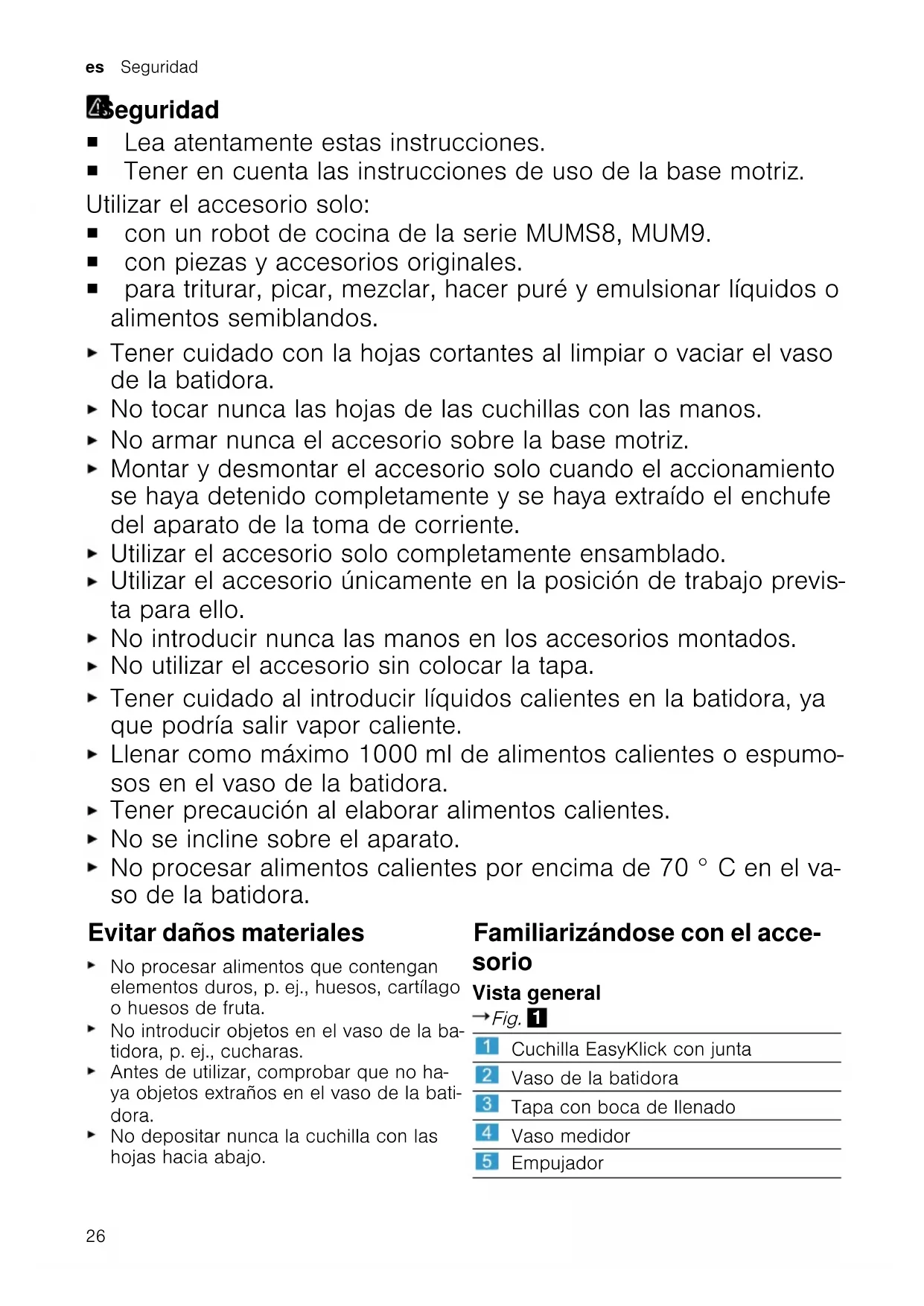 Cuchilla EasyKlick con junta Vaso de la batidora Tapa con boca de llenado Vaso medidor Empujador 26Manejo es ManejoManejo Vista general de las bases motrices Este accesorio se puede utilizar con distin- tas bases motrices. Prepare el robot de cocina tal como se muestra en la ilustración. Fig.