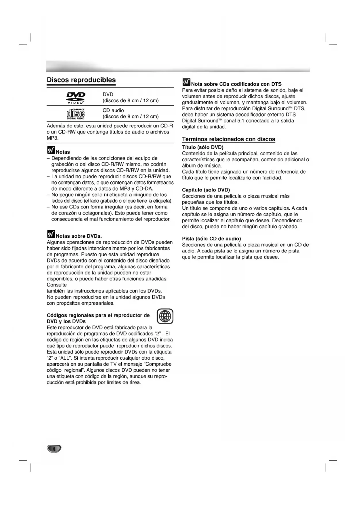 tener una etiqueta con c digo dela regi n, aunque repro-ducci nest prohibida porl mitesderea.NotasobreCDscodificados con DTSParaevitar posible da oalsistemade sonido, baje elvolumen antes reproducir dichos discos, ajuste gradualmente volumen, ymantenga bajo elvolumen.Paradisfrutarde reproducci n Digital SurroundTMDTS,debehaber sistemadecodificador externo DTS Digital SurroundTMcanal5.1conectado lasalida digital delaunidad. Terminos relacionados con discos Titulo (solo DVD) Contenidodela pel cula principal, contenidodelascaracter sticasquele acompa an, contenidoadicional lbumdem sica.Cadat tulotiene asignado