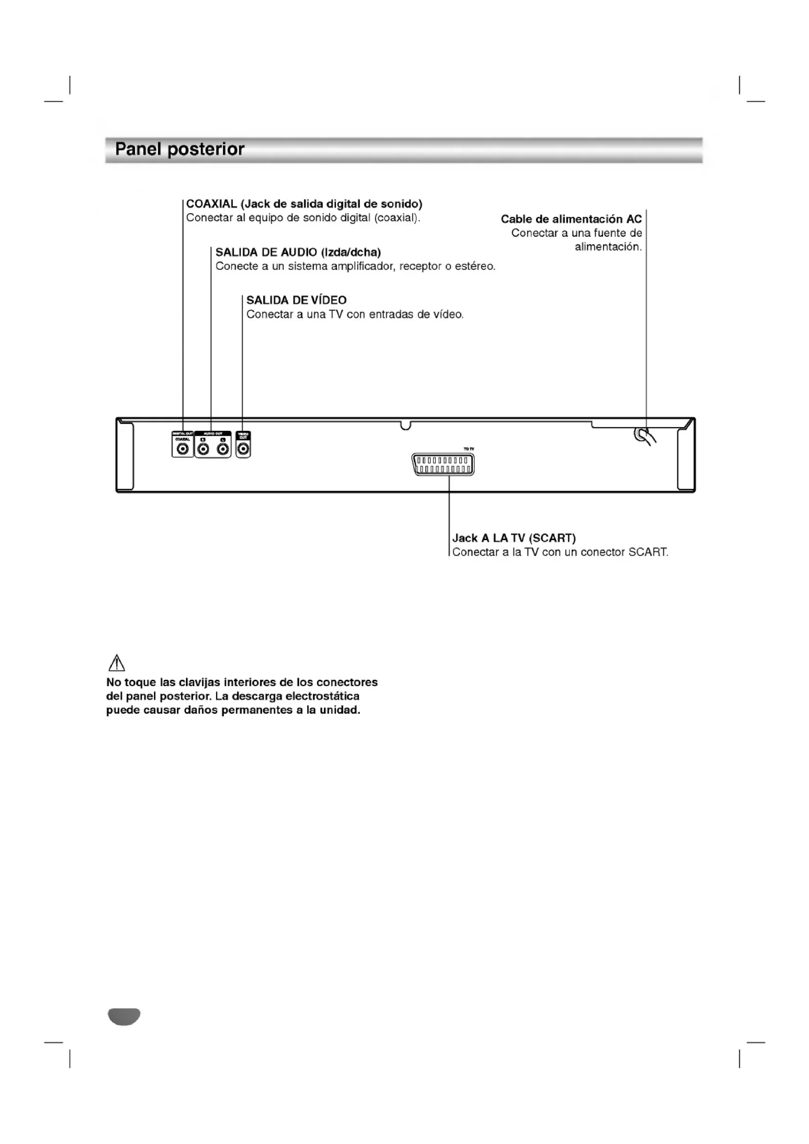 elmenude BUSQUEDA DEMARCADOR REPEAT(REPETIR)Repetir capitulo, pista, titulo, todos. A-BRepetirlasecuencia. RANDOM(ALEATORIO)Reproducelaspistas ordenaleatorio. ZOOMAumentalaimagendevideo.8 Panel posterior toque las clavijas interioresdelosconectoresdel panel posterior. descarga electrostatica puede causardanos permanentes alaunidad.COAXIAL (Jack desalida digital sonido) Conectaral equipo desonido digital (coaxial). SALIDADEAUDIO (Izda/dcha) Conecteaunsistema amplificador, receptor oestereo.SALIDADE VIDEO ConectaraunaTVconentradasdevideo.Cablede alimentacion ACConectaraunafuentedealimentacion.JackALA TV (SCART) ConectaralaTVconunconectorSCART.Conexiones SugerenciaDependiendodesuTVydeotroequpoquedeseeconectar,hayvariasmanerasenlasquepuedeconectarelreproductor.Usesolounadelasconexionesdescritasabajo.Porfavor,consultelosmanualesdesuTV,video,sistemademusicayotrosdispositivossegunseanecesarioparahacerlasconexionesmasapropiadas.Paramejorreproducciondesonido,conectelosconectoresdeAUDIOOUTalosconectoresdeaudiodesuequipoamplificador,receptor,estereoodeaudio/video.Vea"Conexionaequipoopcional"enlapagina