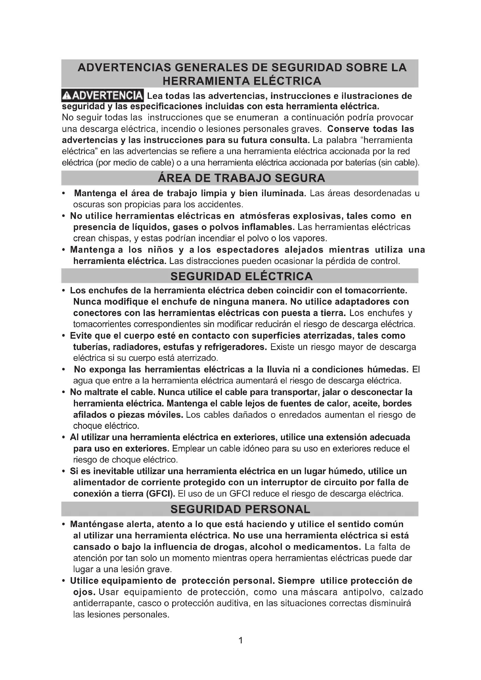 Lea todas las advertencias, instrucciones e ilustraciones de seguridad y las especicaciones incluidas con esta herramienta eléctrica. No seguir todas las instrucciones que se enumeran a continuación podría provocar una descarga eléctrica, incendio o lesiones personales graves. Conserve todas las advertencias y las instrucciones para su futura consulta. La palabra “herramienta eléctrica” en las advertencias se refiere a una herramienta eléctrica accionada por la red eléctrica (por medio de cable) o a una herramienta eléctrica accionada por baterías (sin cable).
