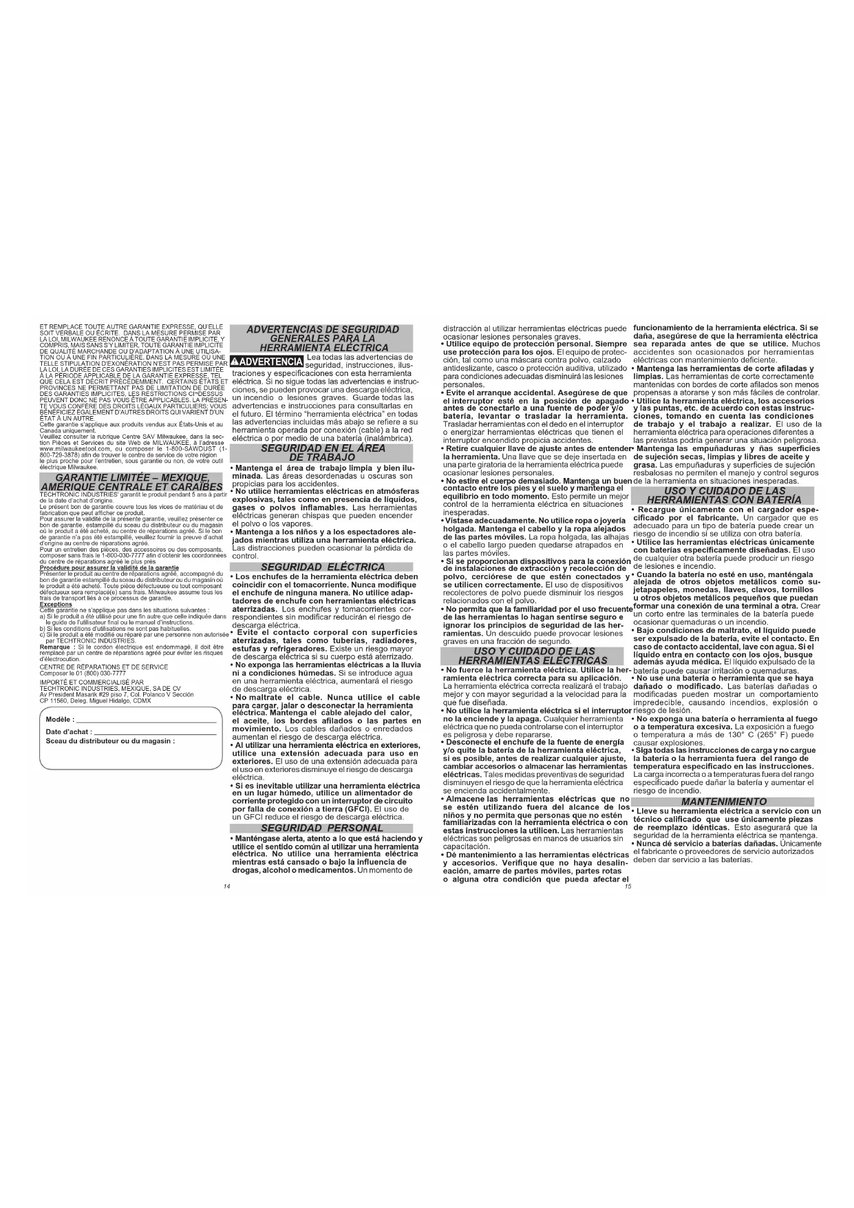 Techtronic Industries Mexico, S.A. de C.V. Av. Presidente Masarik 29 Piso 7 11560 Polanco V Seccion Miguel Hidalgo, Distrito Federal, México 01 (800) 030-7777 o (55) 4160-3540 Lunes a Viernes (9am a 6pm) O contáctanos en www.milwaukeetool.com.mx GARANTÍA LIMITADA - E.U.A. Y CANADÁ Cada herramienta eléctrica* de MILWAUKEE (ver excepciones a con- tinuación) está garantizada para el comprador original únicamente de que no tenga material y mano de obra defectuosos. Sujeto a ciertas excepciones, MILWAUKEE reparará o reemplazará cualquier parte en una herramienta eléctrica que tenga defectos de material o mano de obra según lo determine MILWAUKEE mediante una revisión, por un periodo de cinco (5) años** después de la fecha de compra a menos que se indique lo contrario. Al devolver la herramienta eléctrica a un Centro de Servicio de la fábrica de MILWAUKEE o a una Estación de Servicio Autorizada de MILWAUKEE, se requiere que el ete esté pagado por adelantado y asegurado. Se debe incluir una copia del comprobante de compra con el producto devuelto. Esta garantía no aplica a daños que MILWAUKEE determine que son ocasionados por reparaciones o intentos de reparaciones realizados por una persona que no sea personal autorizado de MILWAUKEE, uso indebido, alteraciones, maltrato, desgaste normal, falta de mantenimiento o accidentes. Desgaste normal: Muchas herramientas eléctricas necesitan un reemplazo periódico de partes y servicio para lograr el mejor des- empeño. Esta garantía no cubre la reparación cuando el uso normal ha agotado la vida de una parte, incluyendo sin limitar a mandriles, cepillos, cables, zapatas de la sierra, abrazaderas de la hoja, anillos en O, sellos, protectores, hojas de desatornilladores, pistones, herrajes, levantadores y arandelas de cubierta de los protectores.58140050D1 961016221-01(B) 06/17 Printed in China MILWAUKEE TOOL 13135 West Lisbon Road Brookeld, WI 53005 USA *Esta garantía no cubre clavadoras y grapadoras neumáticas, pistola de pintura a presión, baterías inalámbricas, generadores de energía portátil de gasolina, herramientas de mano, palanca y cadena de mano de polipasto - eléctricas, indumentaria calefactada M12™, producto reacondicionado y productos de prueba y medición. Existen garantías por separado y distintas disponibles para estos productos. **El periodo de garantía para los radios para obra, puerto de energía M12™, fuente de poder M18™, ventiladores para obra y carretillas de trabajo industrial Trade Titan™ es de un (1) año a partir de la fecha de compra. El periodo de garantía para los Cables de limpieza de drenaje es de dos (2) años a partir de la fecha de compra. El periodo de garantía de la Pistola de calor compacta M18™ de la Extractor de polvo de 8 galones es de tres (3) años a partir de la fecha de com- pra. El periodo de garantía de las lámparas de LED en la Lámpara de trabajo LED y el Bulbo mejorado de LED para la Luz de trabajo es por la vida del producto sujeto a las limitaciones anteriores. Si durante el uso normal el LED o Bulbo de LED falla, la parte será reemplazada sin cargo. No se requiere el registro de la garantía para obtener la garantía cor- respondiente a un producto de herramienta eléctrica de MILWAUKEE. La fecha de manufactura del producto se utilizará para determinar el periodo de garantía si no se proporciona comprobante de compra al solicitar el servicio en garantía. LA ACEPTACIÓN DE LOS REMEDIOS EXCLUSIVOS DE REPA- RACIÓN Y REEMPLAZO AQUÍ DESCRITOS ES UNA CONDICIÓN DEL CONTRATO PARA LA COMPRA DE TODO PRODUCTO DE MILWAUKEE. SI USTED NO ACEPTA ESTA CONDICIÓN, NO DEBE COMPRAR EL PRODUCTO. MILWAUKEE NO SERÁ RE- SPONSABLE EN NINGÚN CASO DE DAÑOS INCIDENTALES, ES- PECIALES, EMERGENTES O PUNITIVOS NI DE NINGÚN COSTO, HONORARIOS LEGALES, GASTOS, PÉRDIDAS O DEMORAS ALE- GADOS COMO CONSECUENCIA DE ALGÚN DAÑO, FALLA O DE- FECTO EN NINGÚN PRODUCTO, INCLUYENDO, ENTRE OTROS, RECLAMACIONES POR PÉRDIDA DE UTILIDADES. ALGUNOS ESTADOS NO PERMITEN LA EXCLUSIÓN O LIMITACIÓN DE RE- SPONSABILIDAD POR DAÑOS INCIDENTALES O EMERGENTES, POR LO QUE LA ANTERIOR LIMITACIÓN O EXCLUSIÓN PODRÍA NO APLICARSE EN SU CASO. ESTA GARANTÍA ES EXCLUSIVA Y REEMPLAZA TODAS LAS DEMÁS GARANTÍAS EXPRESAS, ES- CRITAS U ORALES. EN LA MEDIDA EN QUE LO PERMITA LA LEY, MILWAUKEE DESCONOCE CUALQUIER GARANTÍA IMPLÍCITA, INCLUYENDO SIN LIMITACIÓN CUALQUIER GARANTÍA IMPLÍCITA DE COMERCIABILIDAD O IDONEIDAD PARA UN FIN O USO ESPE- CÍFICO; EN LA MEDIDA EN QUE DICHO DESCONOCIMIENTO NO SEA PERMITIDO POR LA LEY, DICHAS GARANTÍAS IMPLÍCITAS SE LIMITAN A LA DURACIÓN DE LA GARANTÍA EXPRESA COR- RESPONDIENTE SEGÚN SE DESCRIBIÓ ANTERIORMENTE.