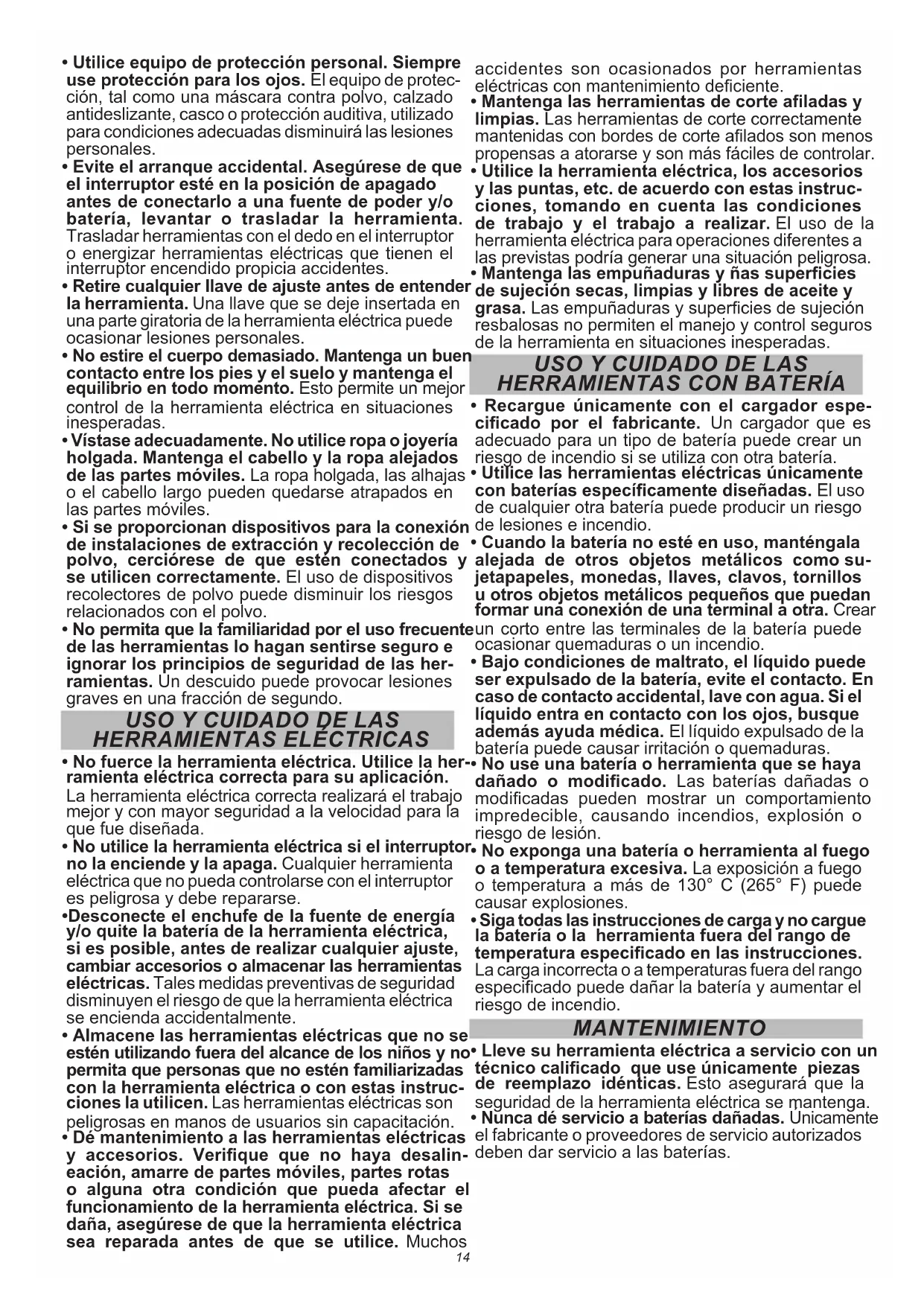 - Manténgase alerta, atento a lo que está haciendo y utilice el sentido común al utilizar una herramienta eléctrica. No utilice una herramienta eléctrica mientras está cansado o bajo la inuencia de drogas, alcohol o medicamentos. Un momento de distracción al utilizar herramientas eléctricas puede ocasionar lesiones personales graves.14