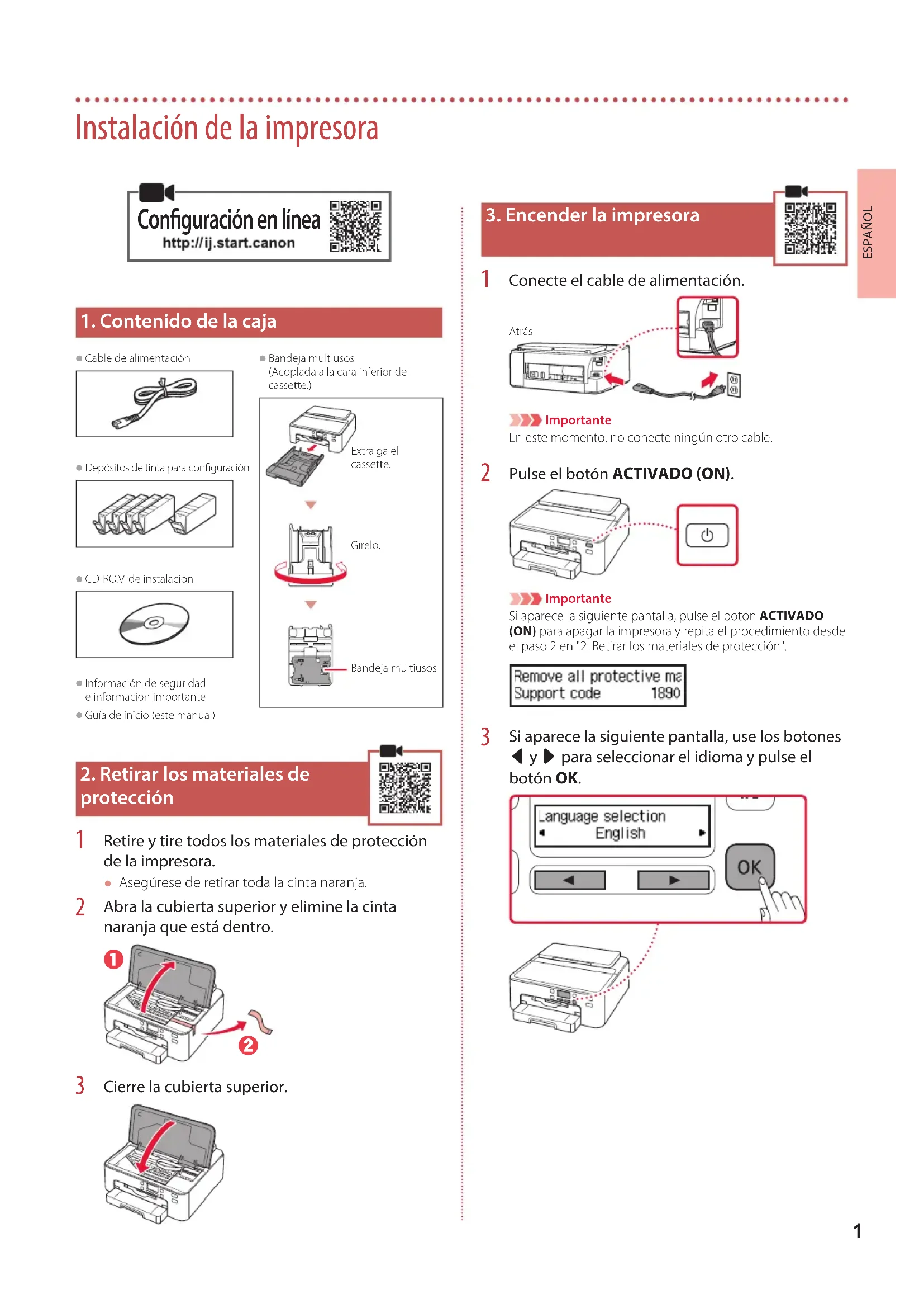 Cable de alimentación Bandeja multiusos (Acoplada a la cara inferior del cassette.)Extraiga el cassette.Gírelo.Bandeja multiusos Depósitos de tinta para conguración CD-ROM de instalación Información de seguridad einformación importante Guía de inicio (este manual)