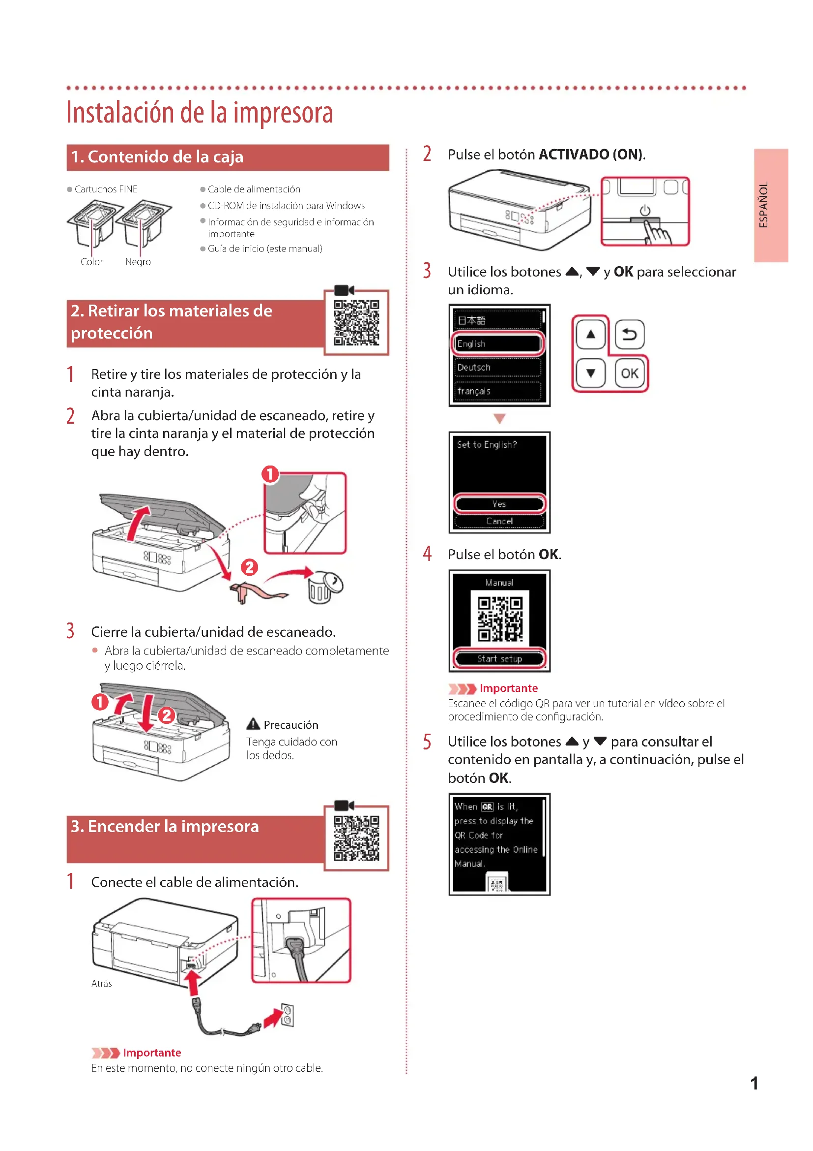 Cartuchos FINEColorNegro Cable de alimentación CD-ROM de instalación para Windows Información de seguridad e información importante Guía de inicio (este manual)