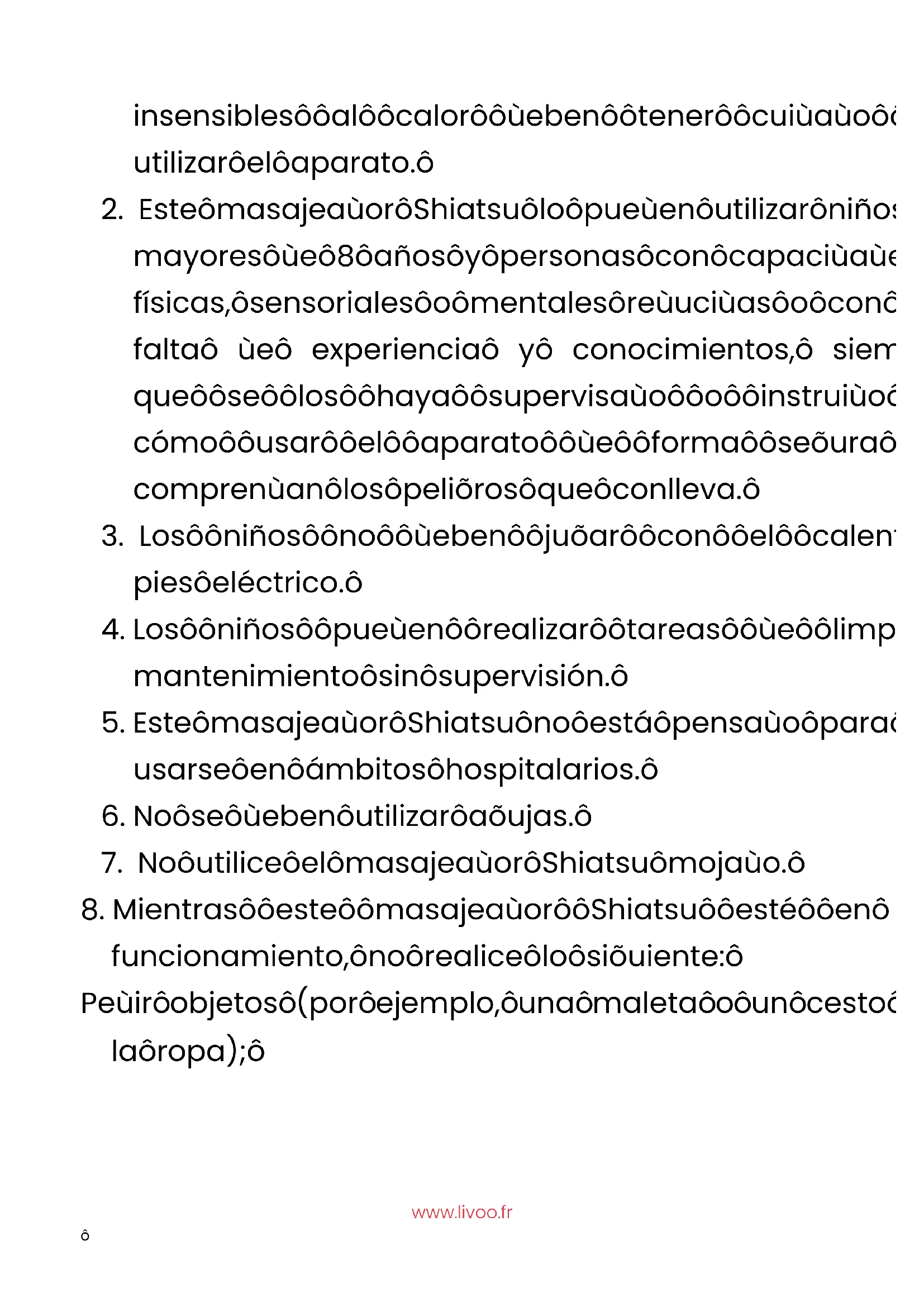 funcionamiento, no realice lo siguiente: Pedir objetos (por ejemplo, una maleta o un cesto de la ropa);www.livoo.fr Instalar desde una fuente de calor superior, como bolsas de agua caliente, almohadillas térmicas, etc.