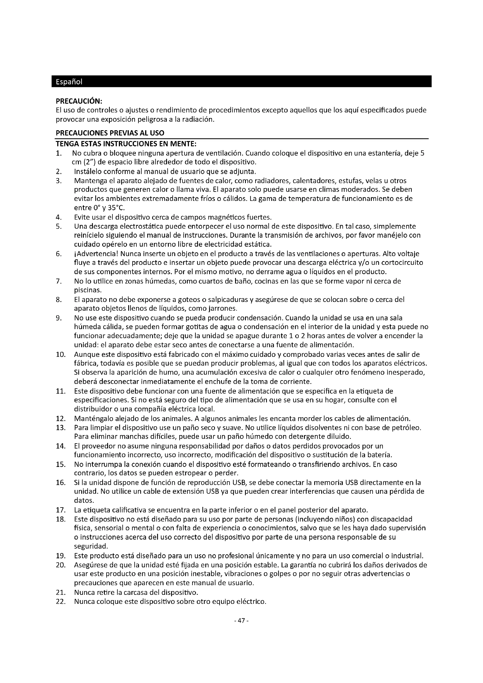 22. Nunca coloque este dispositivo sobre otro equipo eléctrico.- 48 -