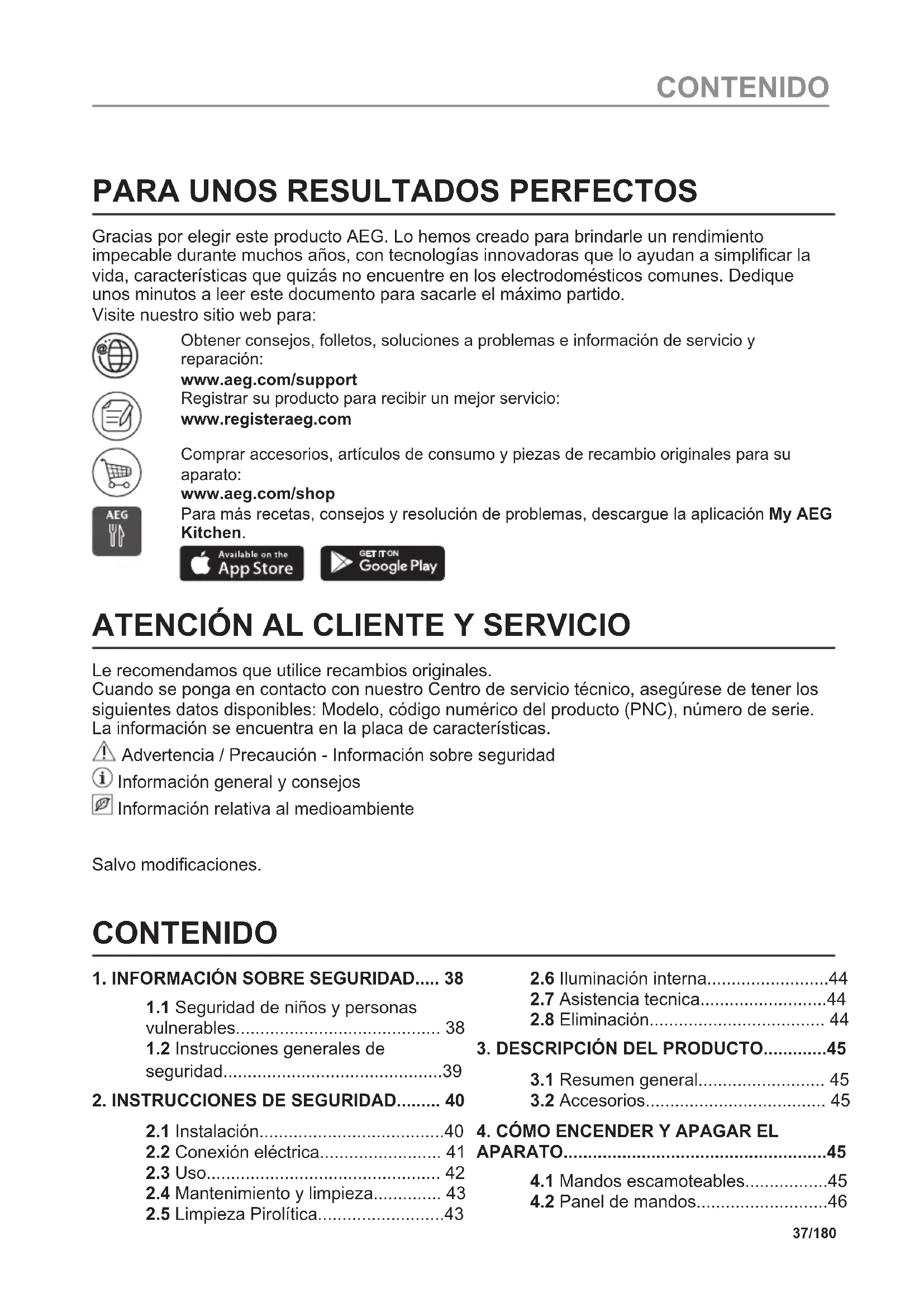 Gracias por elegir este producto AEG. Lo hemos creado para brindarle un rendimiento impecable durante muchos años, con tecnologías innovadoras que lo ayudan a simplificar la vida, características que quizás no encuentre en los electrodomésticos comunes. Dedique unos minutos a leer este documento para sacarle el máximo partido. Visite nuestro sitio web para: Obtener consejos, folletos, soluciones a problemas e información de servicio y reparación: www.aeg.com/support Registrar su producto para recibir un mejor servicio: www.registeraeg.com Comprar accesorios, artículos de consumo y piezas de recambio originales para su aparato: www.aeg.com/shop Para más recetas, consejos y resolución de problemas, descargue la aplicación My AEG Kitchen.