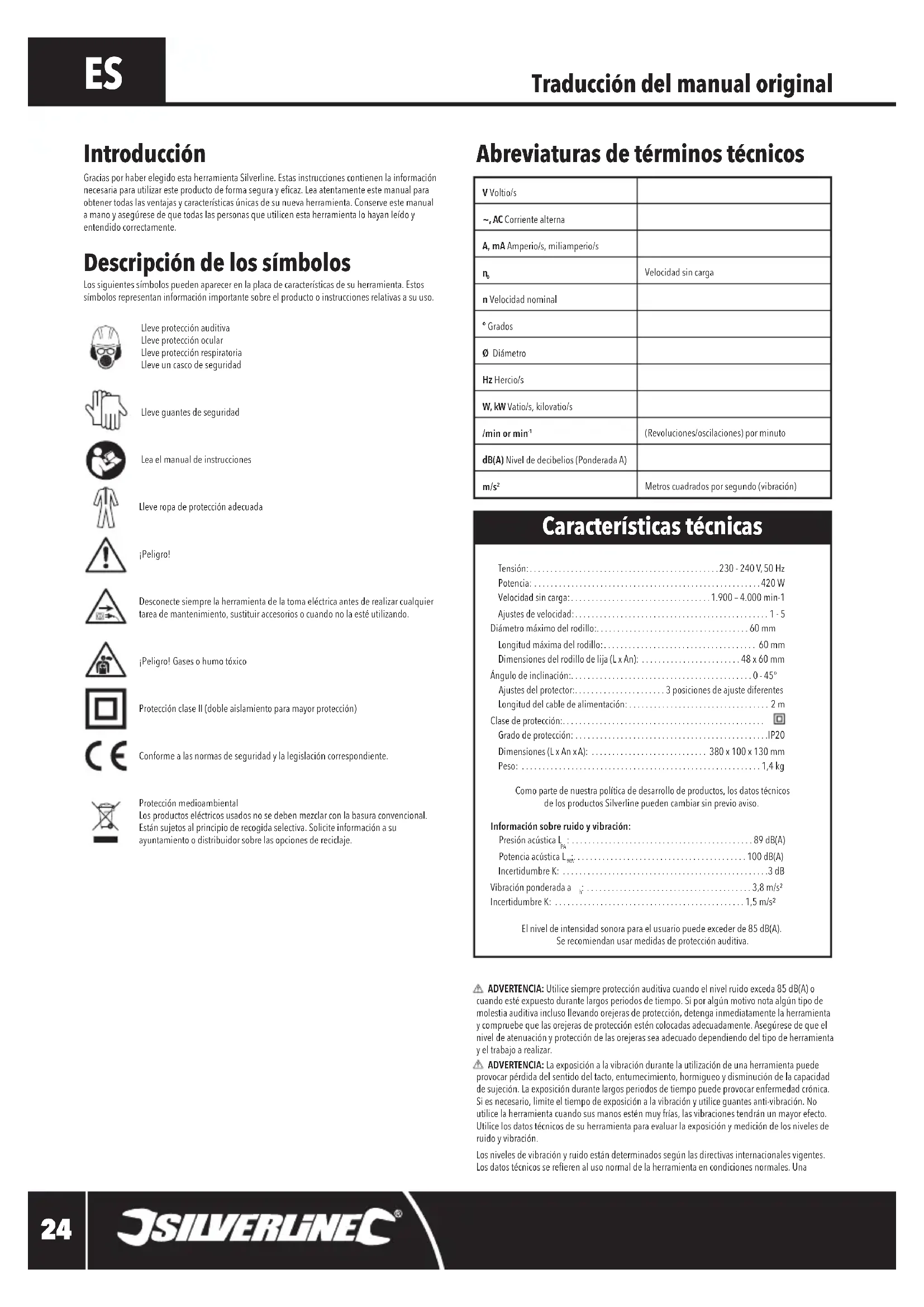 Gracias por haber elegido esta herramienta Silverline. Estas instruetiones contienen la informacion necessaria para utiliser este producto de forma segura y eficaz. Lea atentamente este manual para Obtener todas las ventajas y caracteristicas unicas de su nuova herramienta. Conserve estemanual a mano y asegurese de que todas las personas queutilicen esta herramienta lo hayan leido y entendido correctamente.