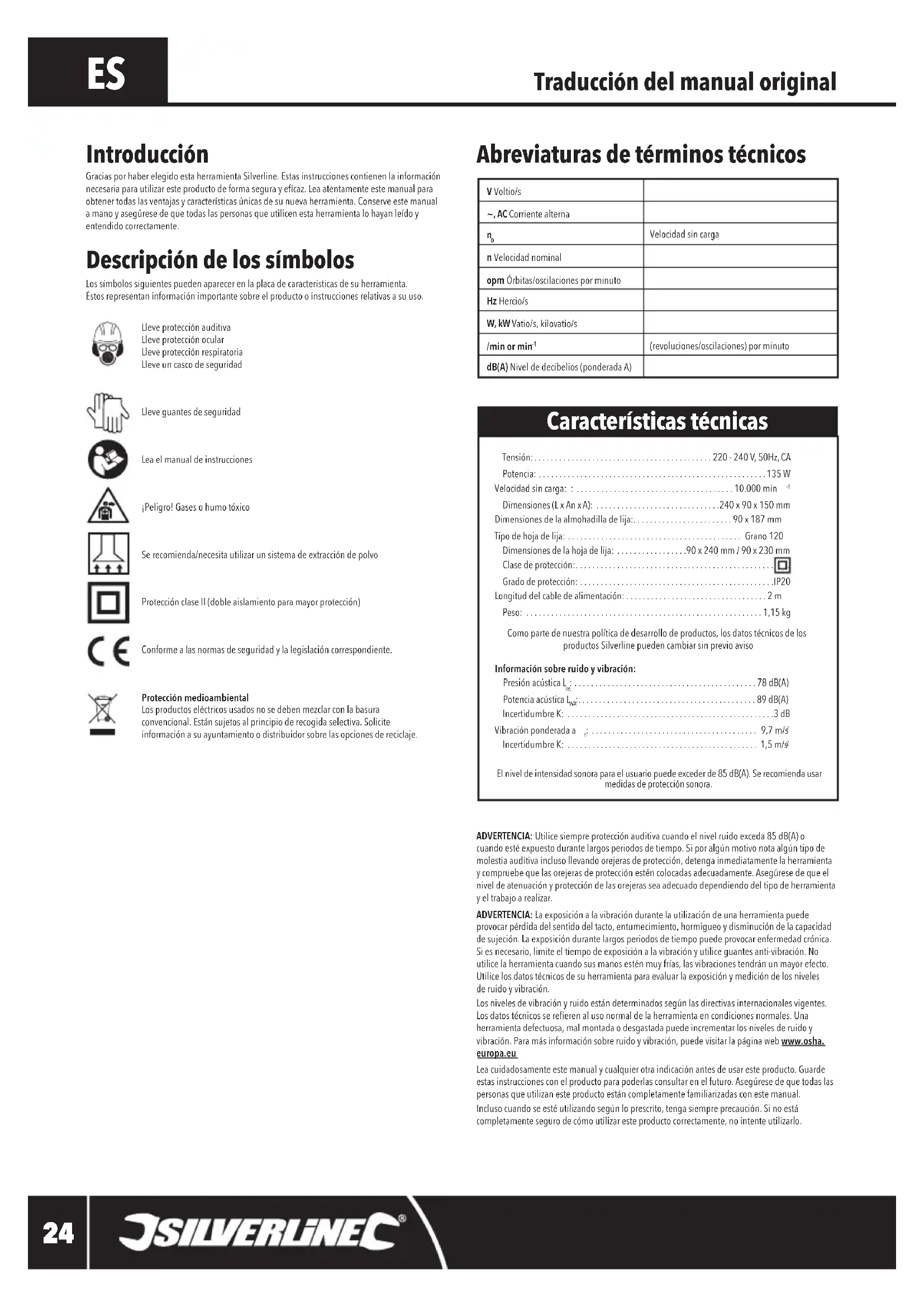 El nivel de intensidad sonora para el usuario puede exceder de 85 dB(A). Se recomienda usar medidas de protección sonora. Características técnicas Descripción de los símbolos Lossímbolossiguientespuedenaparecerenlaplacadecaracterísticasdesuherramienta.Éstos representan información importante sobre el producto o instrucciones relativas a su uso.Lleve protección auditivaLleve protección ocularLleve protección respiratoriaLleve un casco de seguridadLleve guantes de seguridadLea el manual de instrucciones¡Peligro! Gases o humo tóxicoSe recomienda/necesita utilizar un sistema de extracción de polvoProtecciónclaseII(dobleaislamientoparamayorprotección)Conformealasnormasdeseguridadylalegislacióncorrespondiente.Protección medioambiental Losproductoseléctricosusadosnosedebenmezclarconlabasuraconvencional.Estánsujetosalprincipioderecogidaselectiva.Soliciteinformaciónasuayuntamientoodistribuidorsobrelasopcionesdereciclaje. Introducción Gracias por haber elegido esta herramienta Silverline. Estas instrucciones contienen la información necesariaparautilizaresteproductodeformasegurayecaz.Leaatentamenteestemanualparaobtenertodaslasventajasycaracterísticasúnicasdesunuevaherramienta.Conserveestemanualamanoyasegúresedequetodaslaspersonasqueutilicenestaherramientalohayanleídoyentendido correctamente.V Voltio/s~, AC Corriente alterna