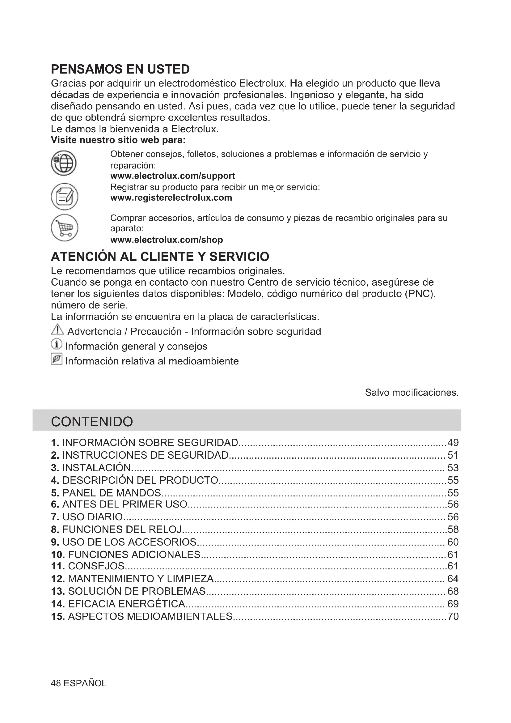 Le recomendamos que utilice recambios originales. Cuando se ponga en contacto con nuestro Centro de servicio técnico, asegúrese de tener los siguientes datos disponibles: Modelo, código numérico del producto (PNC), número de serie. La información se encuentra en la placa de características. Advertencia / Precaución - Información sobre seguridad Información general y consejos Información relativa al medioambiente Salvo modificaciones. CONTENIDO