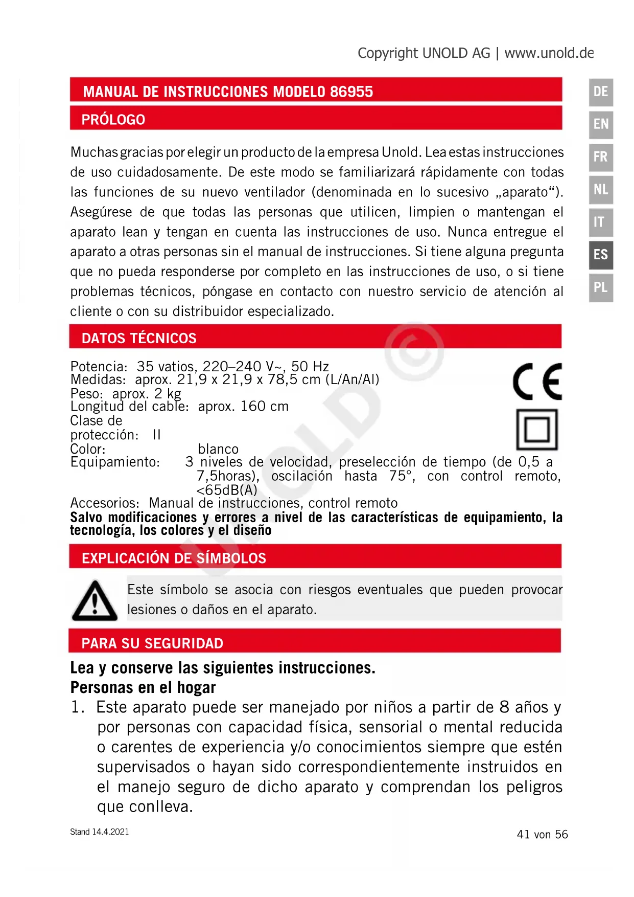 Este símbolo se asocia con riesgos eventuales que pueden provocar lesiones o daños en el aparato. PRÓLOGO Muchas gracias por elegir un producto de la empresa Unold. Lea estas instrucciones de uso cuidadosamente. De este modo se familiarizará rápidamente con todas las funciones de su nuevo ventilador (denominada en lo sucesivo „aparato“). Asegúrese de que todas las personas que utilicen, limpien o mantengan el aparato lean y tengan en cuenta las instrucciones de uso. Nunca entregue el aparato a otras personas sin el manual de instrucciones. Si tiene alguna pregunta que no pueda responderse por completo en las instrucciones de uso, o si tiene problemas técnicos, póngase en contacto con nuestro servicio de atención al cliente o con su distribuidor especializado. Copyright UNOLD AG | www.unold.de UNOLD ©42 von 56 Stand 14.4.2021