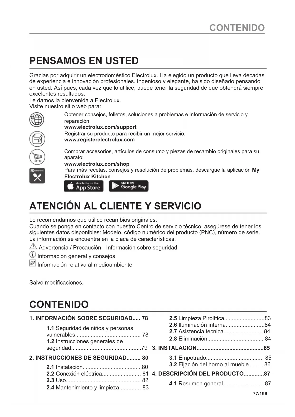 Gracias por adquirir un electrodoméstico Electrolux. Ha elegido un producto que lleva décadas de experiencia e innovación profesionales. Ingenioso y elegante, ha sido diseñado pensando en usted. Así pues, cada vez que lo utilice, puede tener la seguridad de que obtendrá siempre excelentes resultados. Le damos la bienvenida a Electrolux. Visite nuestro sitio web para: Obtener consejos, folletos, soluciones a problemas e información de servicio y reparación: www.electrolux.com/support Registrar su producto para recibir un mejor servicio: www.registerelectrolux.com Comprar accesorios, artículos de consumo y piezas de recambio originales para su aparato: www.electrolux.com/shop Para más recetas, consejos y resolución de problemas, descargue la aplicación My Electrolux Kitchen.