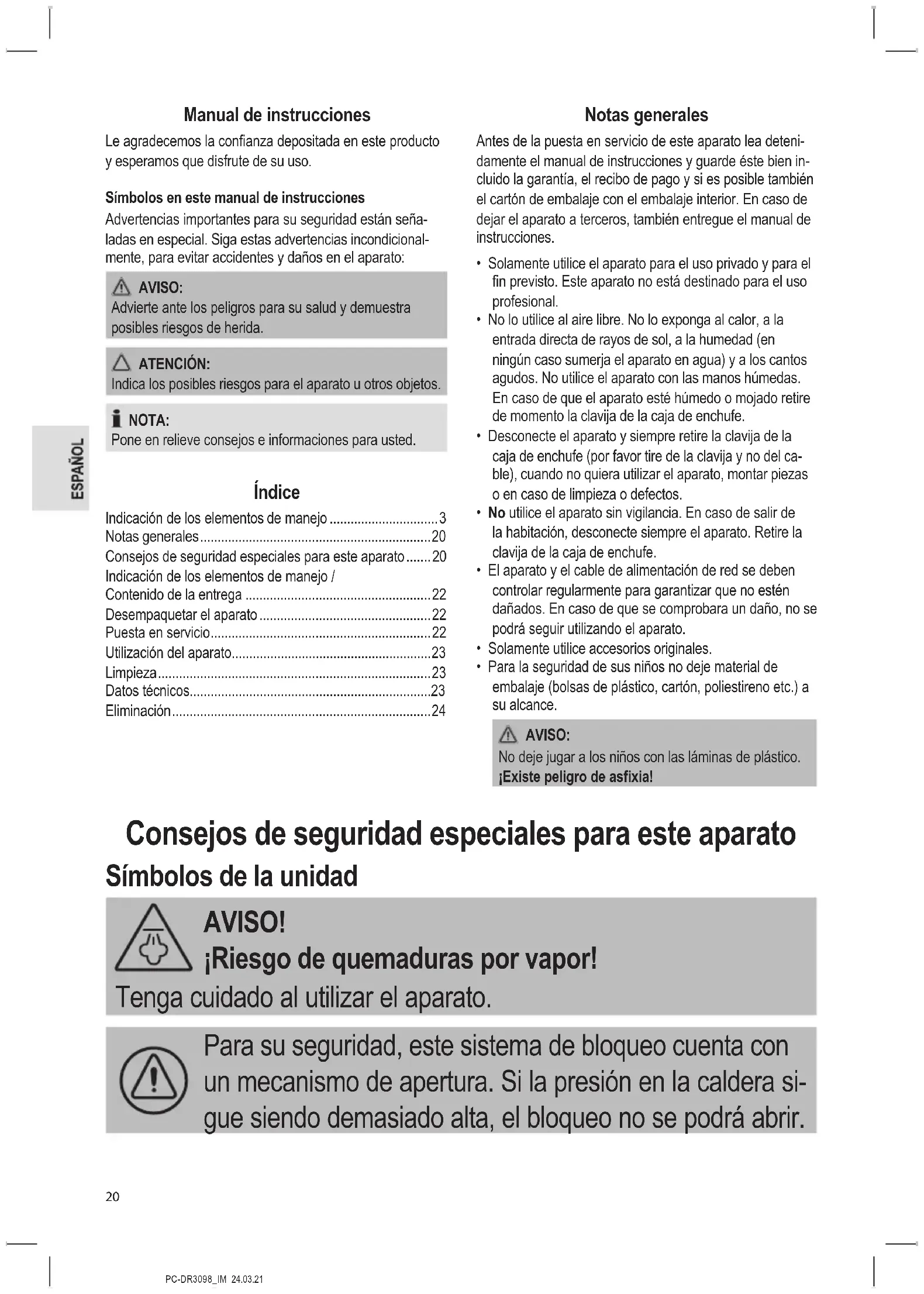 - Para la seguridad de sus niños no deje material de embalaje (bolsas de plástico, cartón, poliestireno etc.) a su alcance. AVISO: No deje jugar a los niños con las láminas de plástico. ¡Existe peligro de asxia! Consejos de seguridad especiales para este aparato Símbolos de la unidad AVISO! ¡Riesgo de quemaduras por vapor! Tenga cuidado al utilizar el aparato. Para su seguridad, este sistema de bloqueo cuenta con un mecanismo de apertura. Si la presión en la caldera si- gue siendo demasiado alta, el bloqueo no se podrá abrir.PC-DR3098_IM 24.03.21