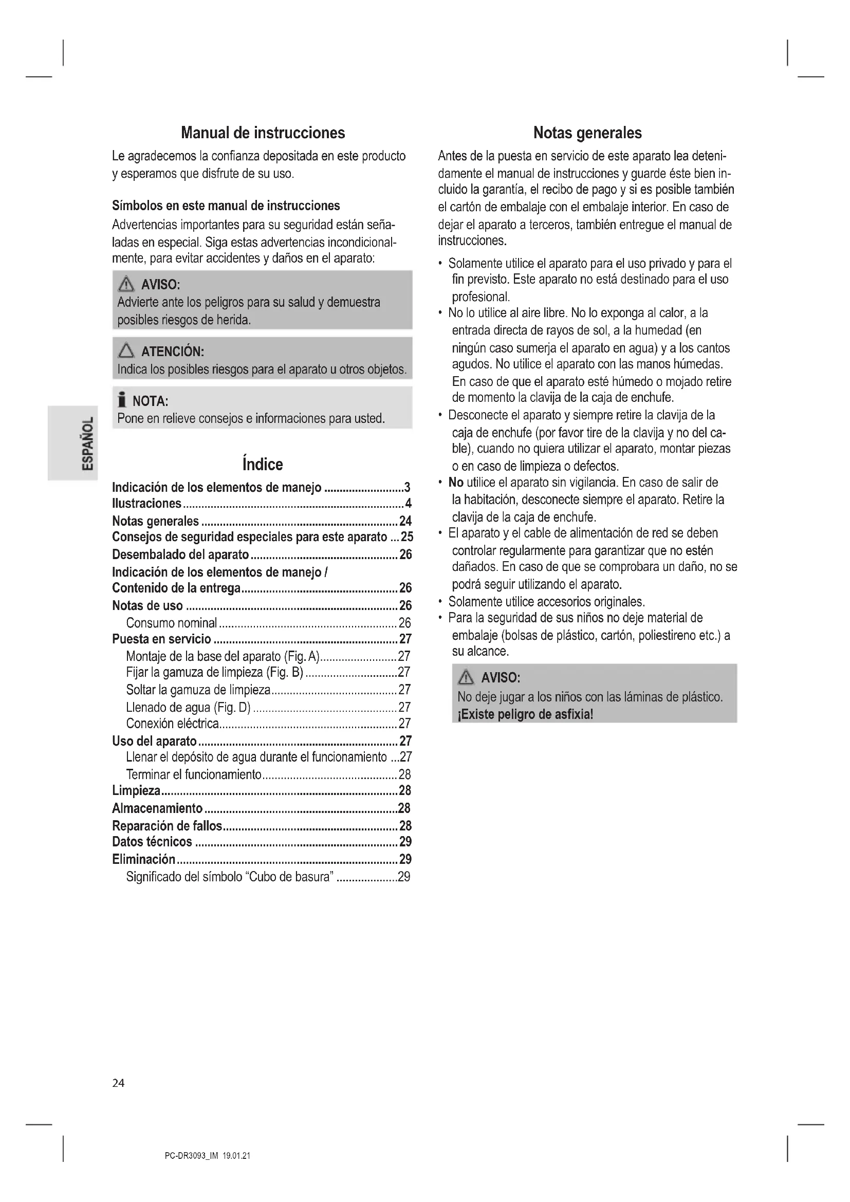 Manual de instrucciones Le agradecemos la conanza depositada en este producto y esperamos que disfrute de su uso. Símbolos en este manual de instrucciones Advertencias importantes para su seguridad están seña- ladas en especial. Siga estas advertencias incondicional- mente, para evitar accidentes y daños en el aparato: AVISO: Advierte ante los peligros para su salud y demuestra posibles riesgos de herida. ATENCIÓN: Indica los posibles riesgos para el aparato u otros objetos. NOTA: Pone en relieve consejos e informaciones para usted. Índice Indicación de los elementos de manejo ..........................3 Ilustraciones ........................................................................ 4 Notas generales ................................................................24 Consejos de seguridad especiales para este aparato