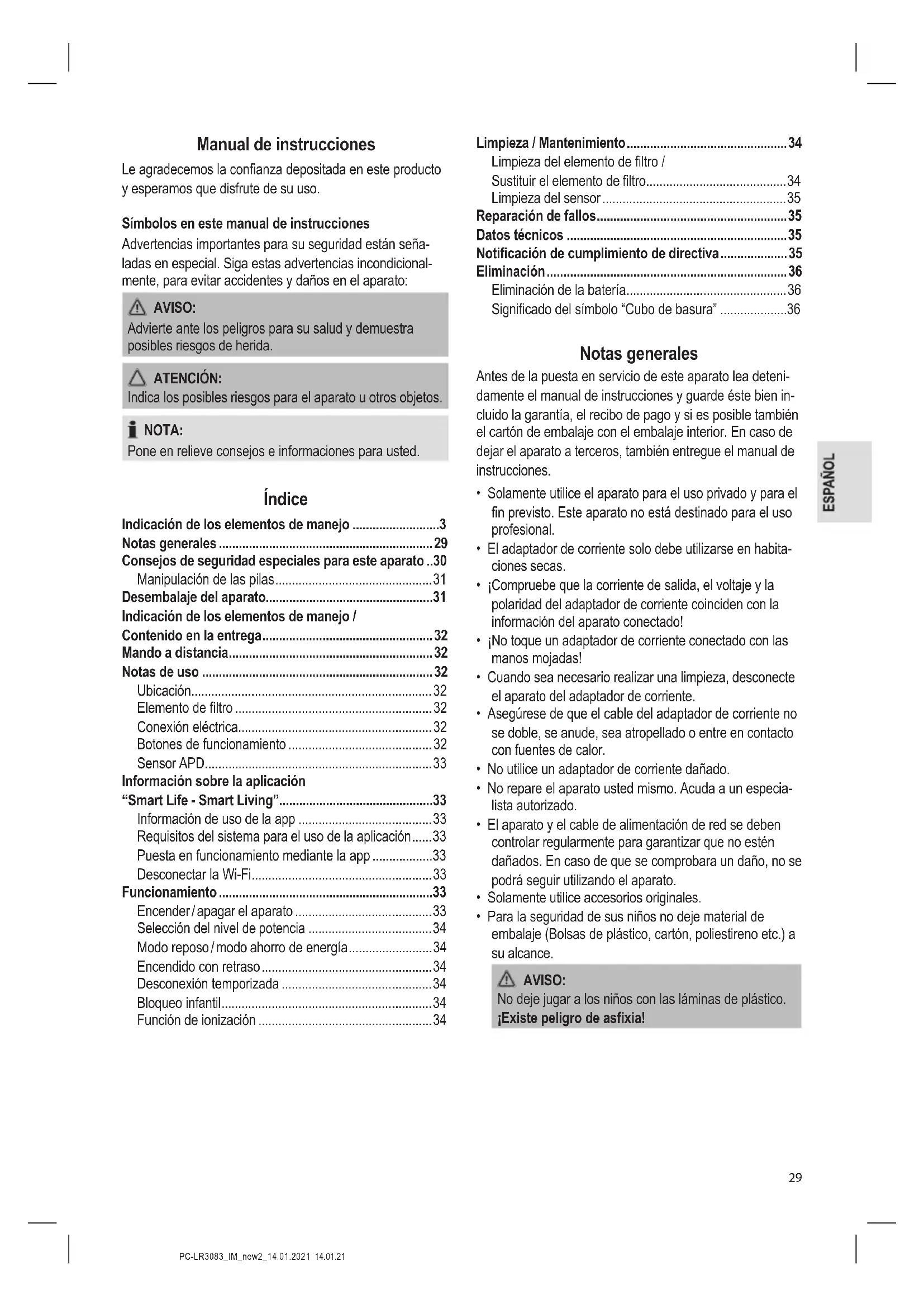 - Para la seguridad de sus niños no deje material de embalaje (Bolsas de plástico, cartón, poliestireno etc.) a su alcance. AVISO: No deje jugar a los niños con las láminas de plástico. ¡Existe peligro de asxia!PC-LR3083_IM_new2_14.01.2021 14.01.21