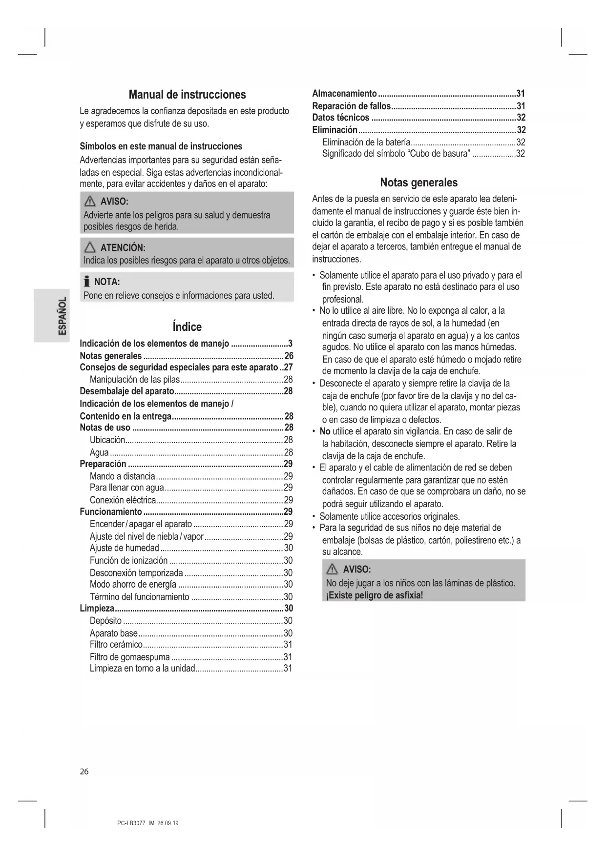 Manual de instrucciones Le agradecemos la conanza depositada en este producto y esperamos que disfrute de su uso. Símbolos en este manual de instrucciones Advertencias importantes para su seguridad están seña- ladas en especial. Siga estas advertencias incondicional- mente, para evitar accidentes y daños en el aparato: AVISO: Advierte ante los peligros para su salud y demuestra posibles riesgos de herida. ATENCIÓN: Indica los posibles riesgos para el aparato u otros objetos. NOTA: Pone en relieve consejos e informaciones para usted. Índice Indicación de los elementos de manejo ..........................3 Notas generales ................................................................26 Consejos de seguridad especiales para este aparato