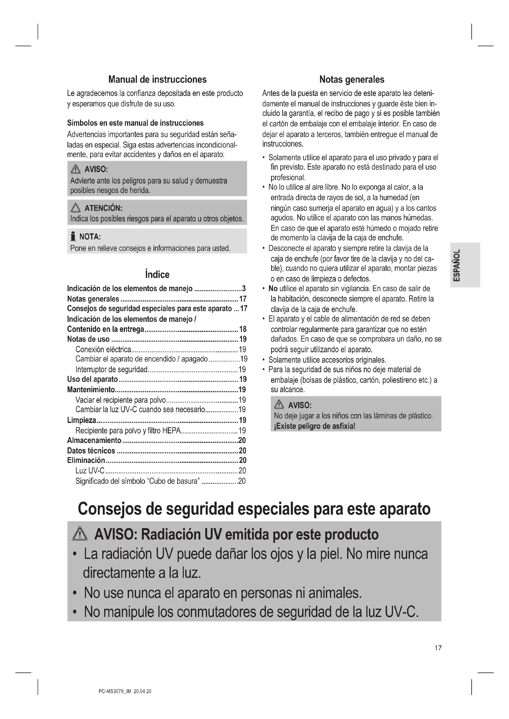 - Alternativamente puede enviarnos la luz. Signicado del símbolo “Cubo de basura” Proteja nuestro medio ambiente, aparatos eléc- tricos no forman parte de la basura doméstica. Haga uso de los centros de recogida previstos para la eliminación de aparatos eléctricos y entregue allí sus aparatos eléctricos que no vaya a utilizar más. Ayudará en evitar las potenciales consecuencias, a causa de una errónea eliminación de desechos, para el medio ambiente y la salud humana. Con ello, contribuirá a la recuperación, al reciclado y a otras formas de reutilización de los aparatos viejos eléctricos y electrónicos. La información cómo se debe eliminar los aparatos, se obtiene en su ayuntamiento o su administración municipal.PC-MS3079_IM 20.04.20