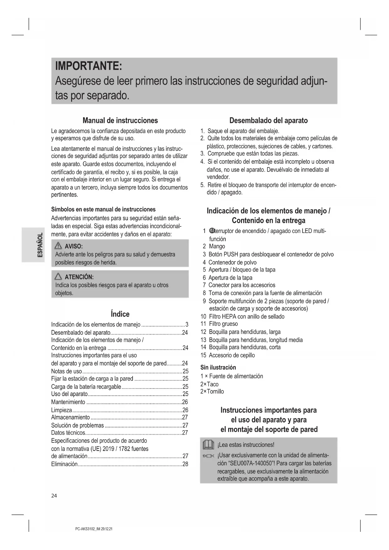 dido / apagado. Indicación de los elementos de manejo / Contenido en la entrega 1 interruptor de encendido / apagado con LED multi- función 2 Mango 3 Botón PUSH para desbloquear el contenedor de polvo 4 Contenedor de polvo 5 Apertura / bloqueo de la tapa 6 Apertura de la tapa 7 Conector para los accesorios 8 Toma de conexión para la fuente de alimentación 9 Soporte multifunción de 2 piezas (soporte de pared / estación de carga y soporte de accesorios) 10 Filtro HEPA con anillo de sellado 11 Filtro grueso 12 Boquilla para hendiduras, larga 13 Boquilla para hendiduras, longitud media 14 Boquilla para hendiduras, corta 15 Accesorio de cepillo Sin ilustración 1 × Fuente de alimentación 2 × Taco 2 × Tornillo Instrucciones importantes para el uso del aparato y para el montaje del soporte de pared ¡Lea estas instrucciones! ¡Usar exclusivamente con la unidad de alimenta- ción “SEU007A-140050”! Para cargar las baterías recargables, use exclusivamente la alimentación extraíble que acompaña a este aparato.PC-AKS3102_IM 29.12.21